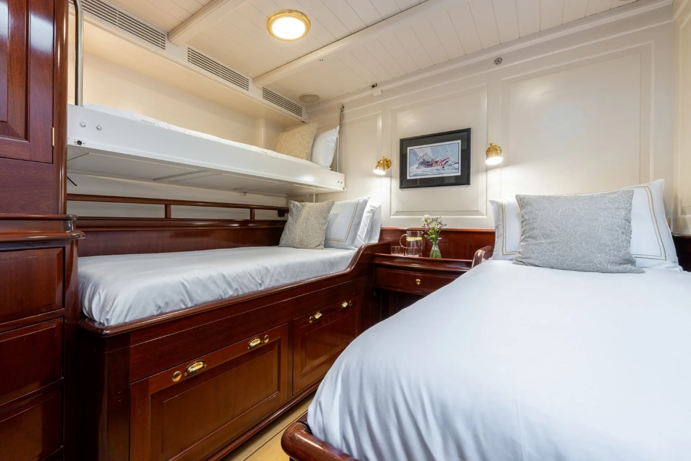 Classic Holland Jachtbouw sailing yacht WINDROSE is able to accommodate up to 8 guests in 4 cabins including a master stateroom with a Queen sized bed, an upper lower twin cabin located aft, and 2 twin cabins with pullman berths located amidships. The two mid twin cabins can convert into 2 King size double cabins if required. All cabins are equipped with en suite facilities. S/Y WINDROSE will accommodate up to 8 guests for charter however, with an additional child or nanny, 9 guests may be considered by the owner.