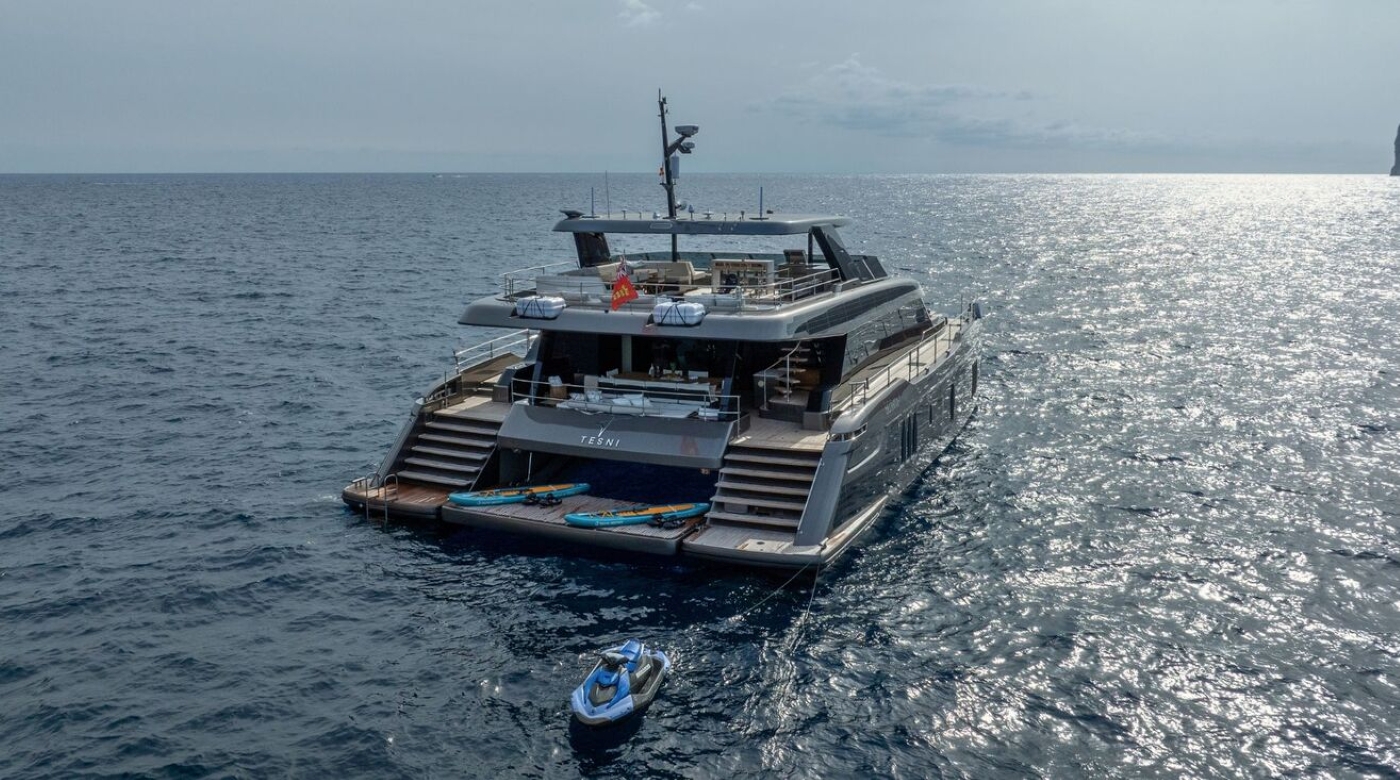 NOTABLE FEATURES OF TESNI: ~ Eco inspired propulsion with partially solar powered systems and Solar Skin 3.0 integration ~ Expansive beam (12.19 m) providing volume and stability ~ Four guest cabins with ensuite bathrooms, elegantly appointed ~ Multiple indoor outdoor living zones with large sliding doors for seamless flow ~ Deck jacuzzi for relaxing al fresco moments ~ Shaded deck seating, outdoor dining and sun lounge areas ~ Generous glazing to flood interiors with natural light ~ Hydraulic swim platform for easy sea access ~ Full air conditioning, WiFi, and modern comfort systems