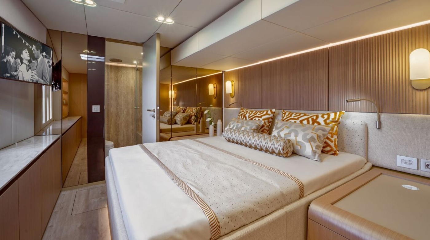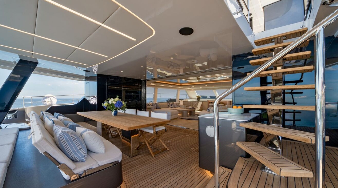 TESNI’s exterior spaces are designed both for sociable gathering and quiet retreat. The flybridge deck serves as a focal point—with lounge seating, sun pads and multiple conversation zones—ideal for sunset drinks or conversation under open sky. The deck jacuzzi offers a spa-like vantage point over sea and horizon.