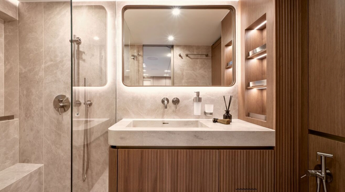 TESNI welcomes up to 8 guests in 4 elegantly appointed cabins. ~ Cabin Count: 4 cabins in total, each with ensuite bathroom ~ Configuration: Typically 4 double cabins (or 3 doubles + 1 twin in some setups) ~ Each cabin features wardrobe storage, refined finishes, en suite shower room and soft natural lighting ~ Cabins are designed to feel intimate and serene, with muted tones and quality materials continuing the aesthetic from the main salon
