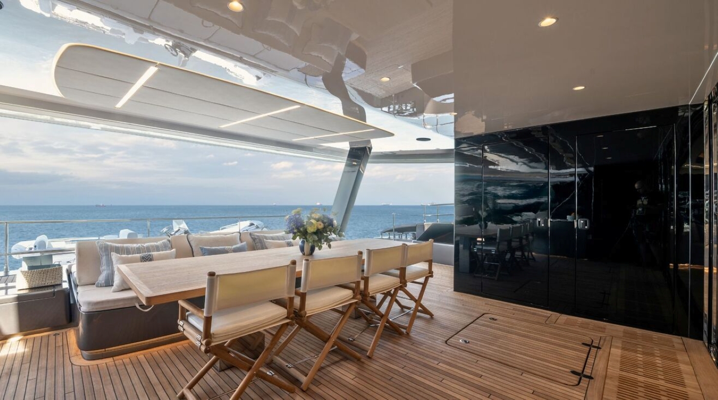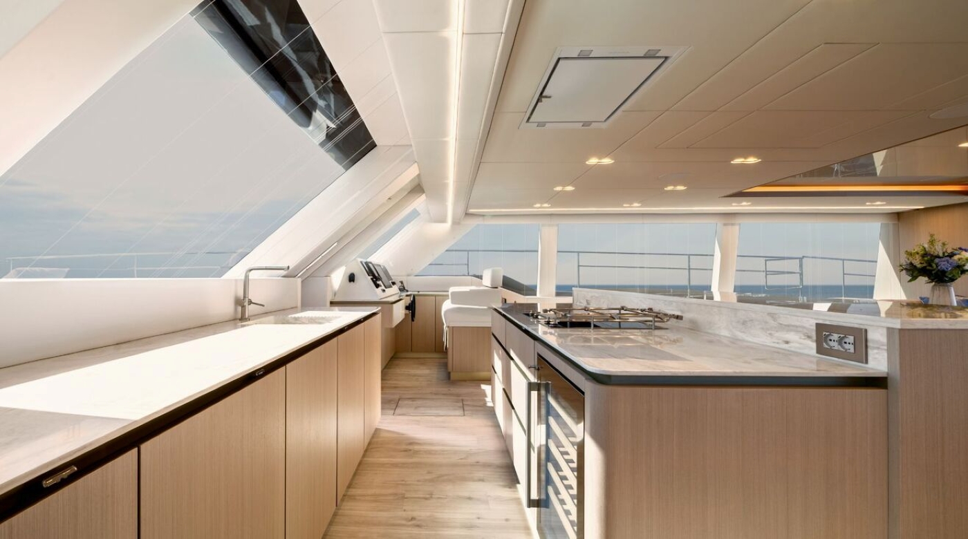 The main salon is open plan: generous seating, bar, dining and lounge zones all benefit from full-height glazing and the ability to open up to the decks. This creates a sense of continuity with the ocean beyond.