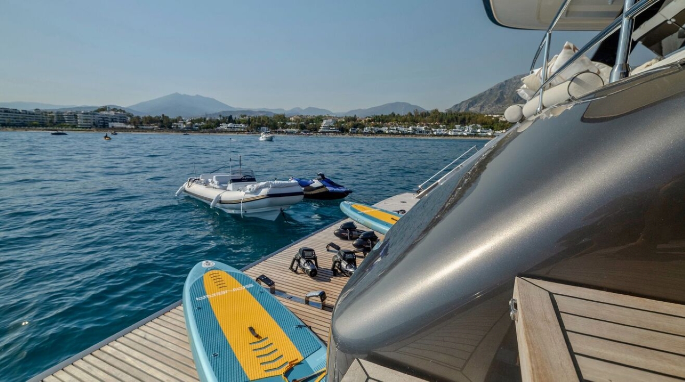 Forward on the catamaran’s bows, there is a generous lounge zone offering panoramic views and a serene lounge platform. A hydraulic swim platform at the stern provides effortless access to the water and serves as a staging area for water toys and tender operations.
