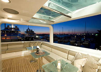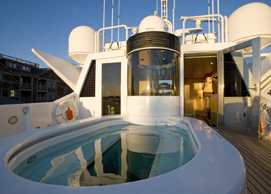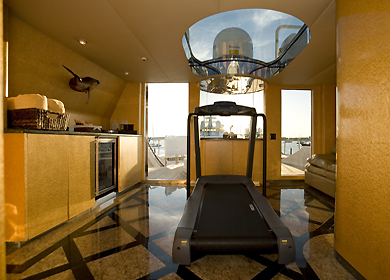 The forward and aft sun deck is separated by a sun lounge and a glass enclosed gym. Aft is the upper sky deck lounge, and forward is a stair case which will take you up to the fly bridge control station and the TV and entertainment centre. There is also a private sauna and private bath with shower, and also a large glass-bottom Spa Pool tub on deck!