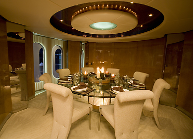 The dining room is on the main deck and is also of a circular shape. There is a large round table which can accommodate dining for 10-12 guests.