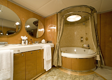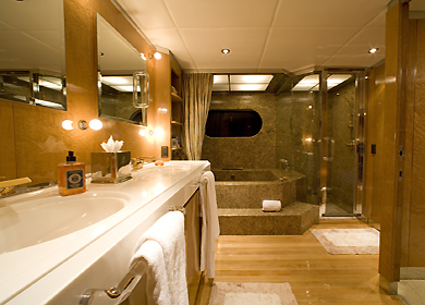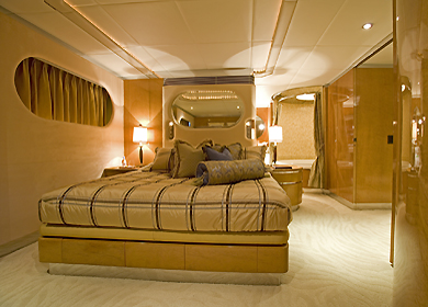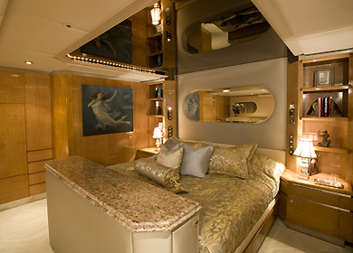 The master stateroom is full beam on the main deck and has a king size bed with an ensuite bathroom and spa pool tub and separate shower. It also has an elevator with a private entrance, a desk and sofa, pop up plasma TV and entertainment system. The VIP stateroom is below deck and has a queen size bed, a settee, built in entertainment centre and a spa pool tub and shower with granite floors. There is also a study area that converts to a guest state room with the use of a retractable centre wall. The guest staterooms are also below deck and have a sofa which converts to a double bed and an entertainment system. The wall dividing the two forward guest rooms can be taken away so it becomes one large VIP room with a study. There is an ensuite bath with marble flooring.