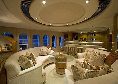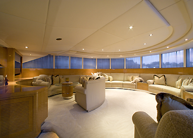 The main salon on the upper deck has a large circular sofa, games table and study. There is also a fully equipped bar. Forward is the large oval shaped "observation salon" with grand piano, circular sofa, entertainment center, and large screen 50" plasma TV with Dolby Surround Sound.