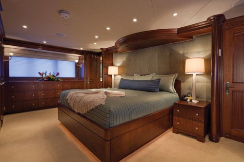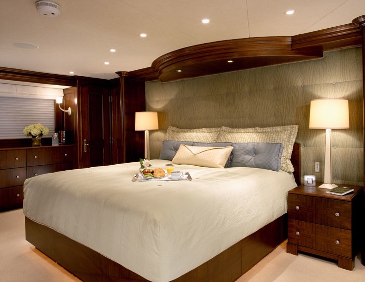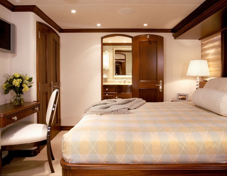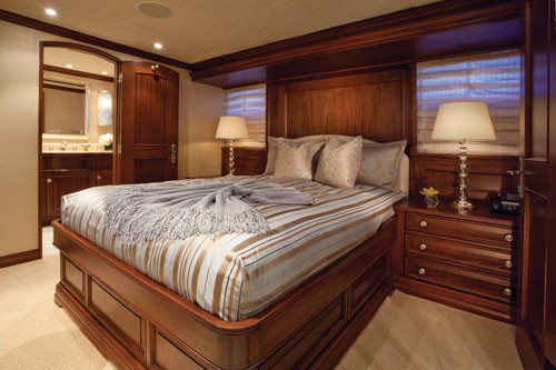 CHILD'S PLAY offers accommodation for up to 10 in 5 cabins. The on-deck Master, two VIP queens below decks plus two twin staterooms can comfortably accommodate a family up to 10 guests. She boasts a full width, main deck, Master Suite and a beam of 25 feet, this is not your average bedroom-on-a-boat. It’s the size of a salon on most boats and it’s located on the same level! VIP stateroom is simply elegant and classic Burger tradition, it is straightforward with little to encumber movement about the cabin.