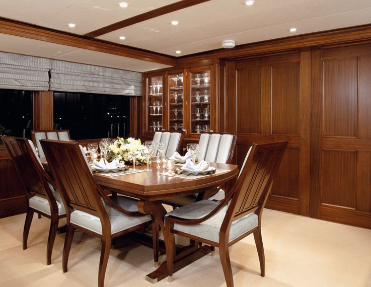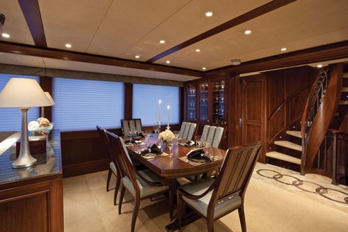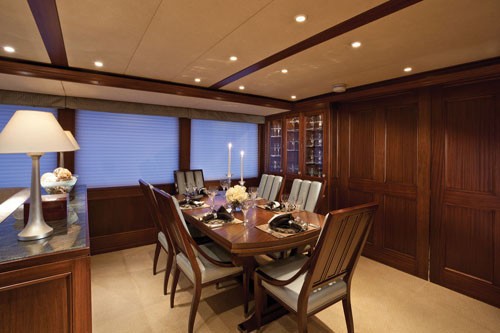 A built-in hutch to port puts the china and crystal close at hand. To starboard, a full service bar is integrated. Forward of the dining area, the staircase and foyer feature sliding doors that close-off the salon for quiet dining.