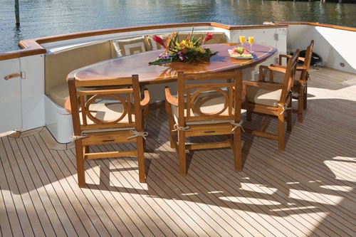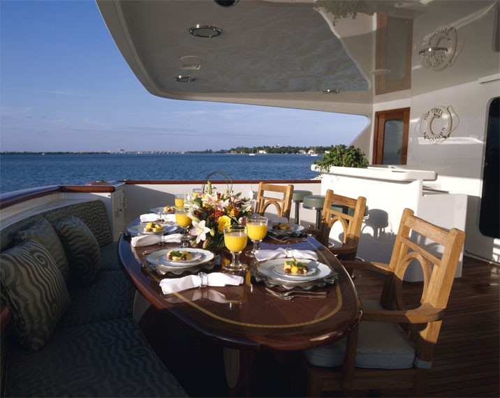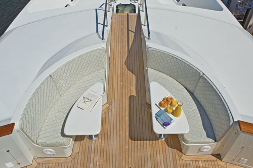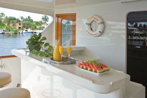 The Aft Deck is fully covered and offers a built-in dining table with seating along with a wet-bar with fastened stools. The aft deck is the most popular entertainment area on any boat and Top Times provides more than ample room for friends. The Portuguese Walk forward of the bridge incorporates dual settees for open-air bow banter and a good vantage point to keep watch over cold-chunks gone astray.