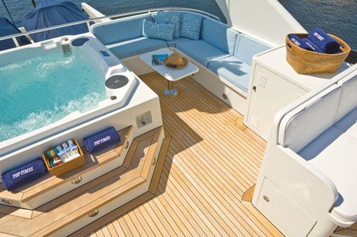 LOOSE ENDS' sky-Deck includes a sun deck with wrap around seating. The aft-mounted hot tub Spa Pool integrates everything from head-rests to drink holders. In the off-season, these tubs can double as a good storage compartment too.