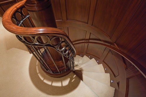 The spiral Staircase, from the main deck to the sky lounge, illustrates some lovely wood-bending and there is an 180 degree twist in the laminated planks over a distance of less than 8 feet.