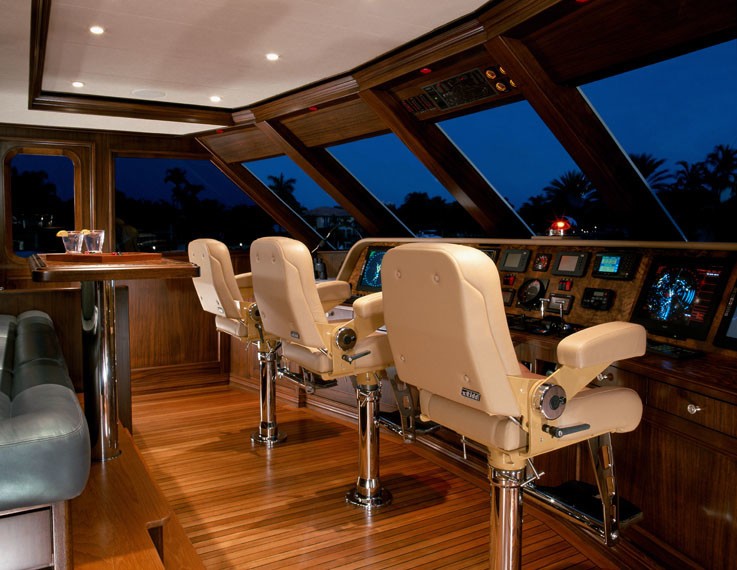 Her sky lounge is rich in all the comforts of home, with ottomans free to float around the room to be positioned as needed. This lounge provides a 270-degree view aft which is only obstructed by something even more fun to look at… water toys on the aft deck.