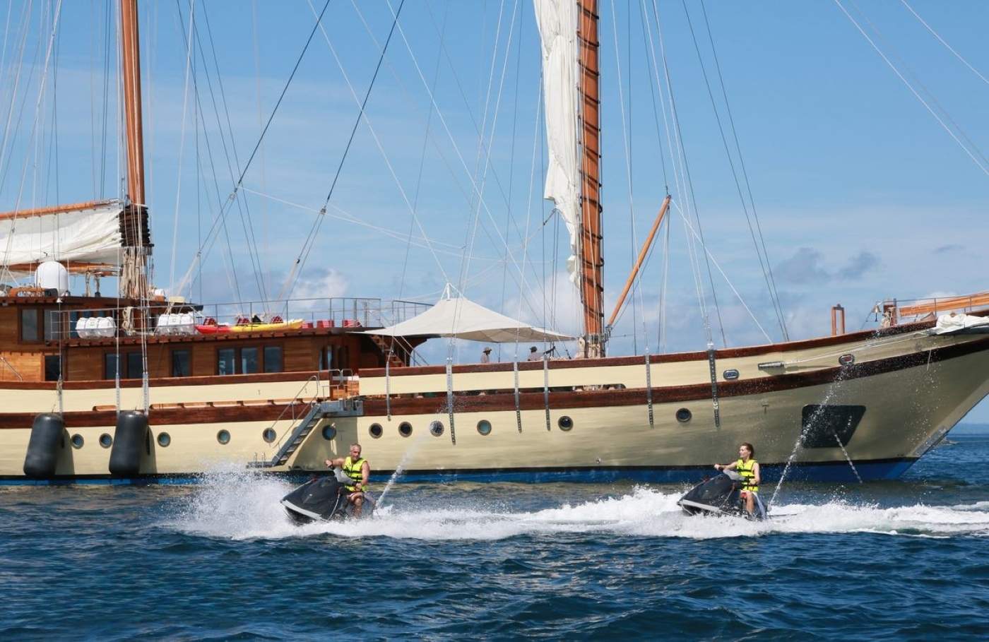 Tender & Toys Tenders: ~1x RIB 11m 250hp outboard ~1x RIB 7m 100hp outboard ~1x RIB 5m 40hp outboard Watertoys: ~2 x E-foils (Flite Air and the Flite Scooter) ~2 x Yamaha jetski (use outside of national parks) ~2 x Underwater SeaScooter ~6 x Stand-up paddle boards ~6 x Surf Boards ~2 x Jukungs (traditional Indonesian canoes) ~2 x Double Sea Kayaks ~1 x Tiwal sailing dinghy ~1 x Wakeboard ~1 x Water Ski set ~Inflatable toys (big banana, O’Brien Mapple) ~Padi diving-center: ~Diving and snorkelling gear for 14 guests ~(2 x Padi instructors able to perform PADI certification) - Padi certification =600 USD /qualification ~Bauer Nitrox compressor: Bauer Poseidon PE250HE/P42 filtration ~1 x CompAir Nitrox Membrane unit with air ditrerier ~EAN at 32% but can adjust if guests want to have 2 x Analox oxygen analysers for all to use before dives.