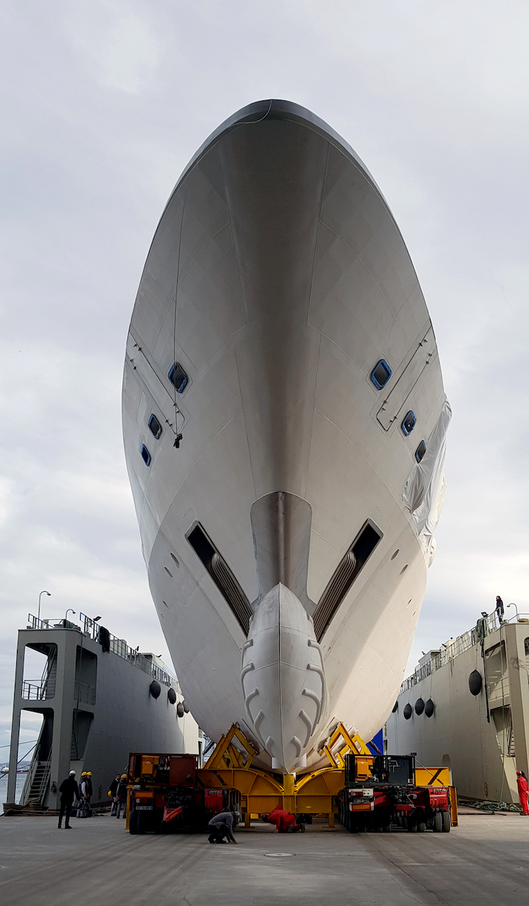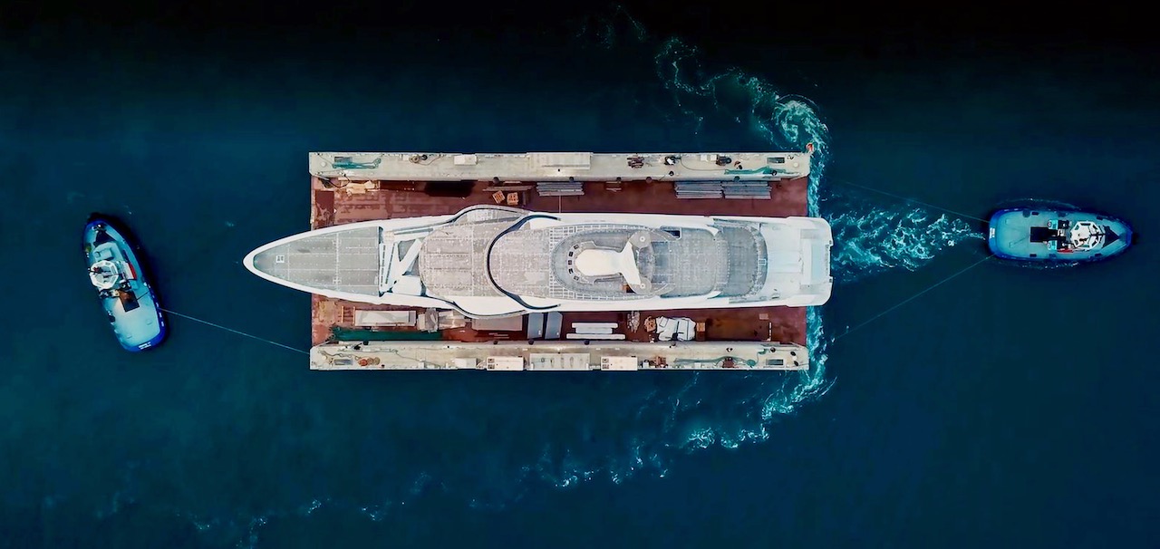 The lower deck hosts the crew accommodation, with the tender garage amidships and a large beach club in the stern that has a fold-down terrace on both sides.