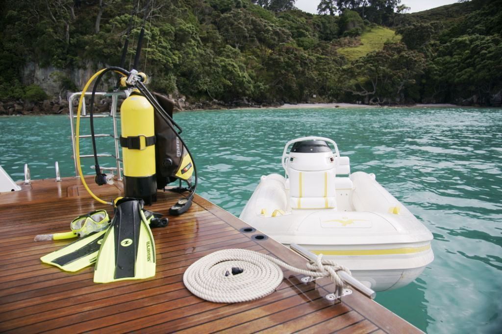 New Zealand motor yacht ULTIMATE ESCAPE is equipped with a full range of yacht toys and equipment including a 14ft rigid bottom inflatable with 40hp outboard, Water skis, ski biscuit, 2 kayaks, snorkeling gear, life jackets and wet suits. The boat is equipped with fishing gear for Game, bottom and deep sea with full complement of fishing equipment including light and game tackle. Entertainment facilities onboard include: 40 inch LCD TV in main saloon with premium sound system, Satellite television, DVD player and selection of music DVDs and Movies. 32 inch LCD in Flying Bridge and 26 inch LCD in Guest Cabins all with DVD players. Communications equipment includes Cellular Mobile Phone, Internet, Facsimile, Internal Phone, SSB Radios and VHF.