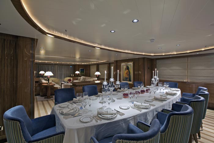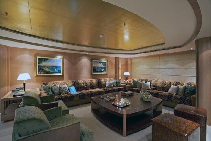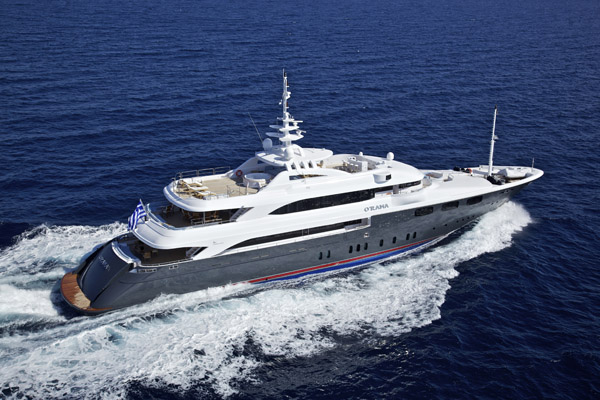 Larger than the previous two, the O’RAMA motor yacht measures 53,54m (175' 7") and was built by Golden Yachts in 2009 with naval architecture by HYDROTEC S.R.L and interior decoration by INTERIN Studio Giorgio Vafiadis. The word RAMA is in in Greek as a suffix meaning view; sight; see, that which is seen. This large steel displacement yacht is able to cruise at 16 knots and has a top speed of 18.5 knots. Her interior design is modern and neutral.