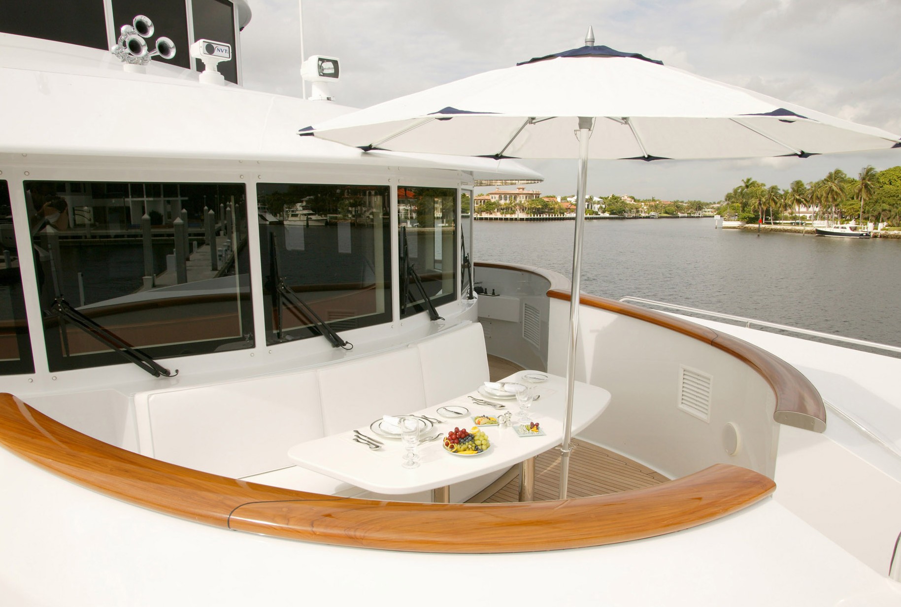 The yacht's general design work came from Trinity Yachts. The technical naval architecture intellectual property are the products of Trinity Yachts. Motor Yacht WHITE STAR received her stylish interior designing from the interior design office of Scott Carpenter. Created by Trinity Yachts the vessel was completed in the country of the United States. She was officially launched in New Orleans LA in 2004 before being transferred to the owner. The hull was crafted from aluminium. The motor yacht main superstructure is made predominantly using aluminium. With a beam of 8.53 metres or 28 feet WHITE STAR has spacious internal space. A reasonably shallow draught of 2.2m (7.3ft) determines the number of marinas she can visit, taking into account their minimum depth at low tide.