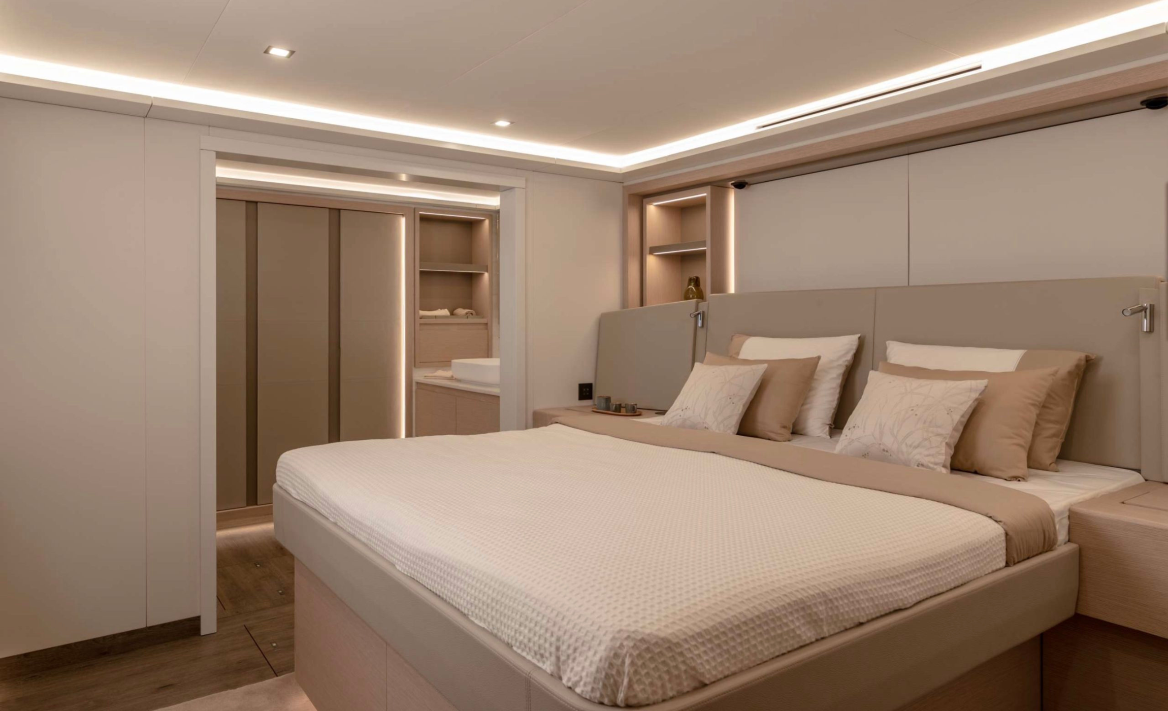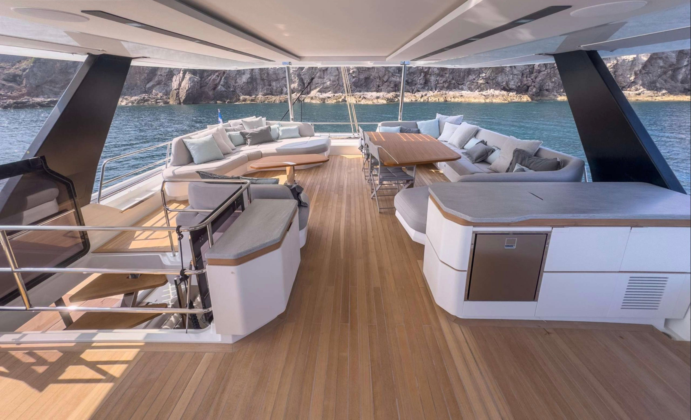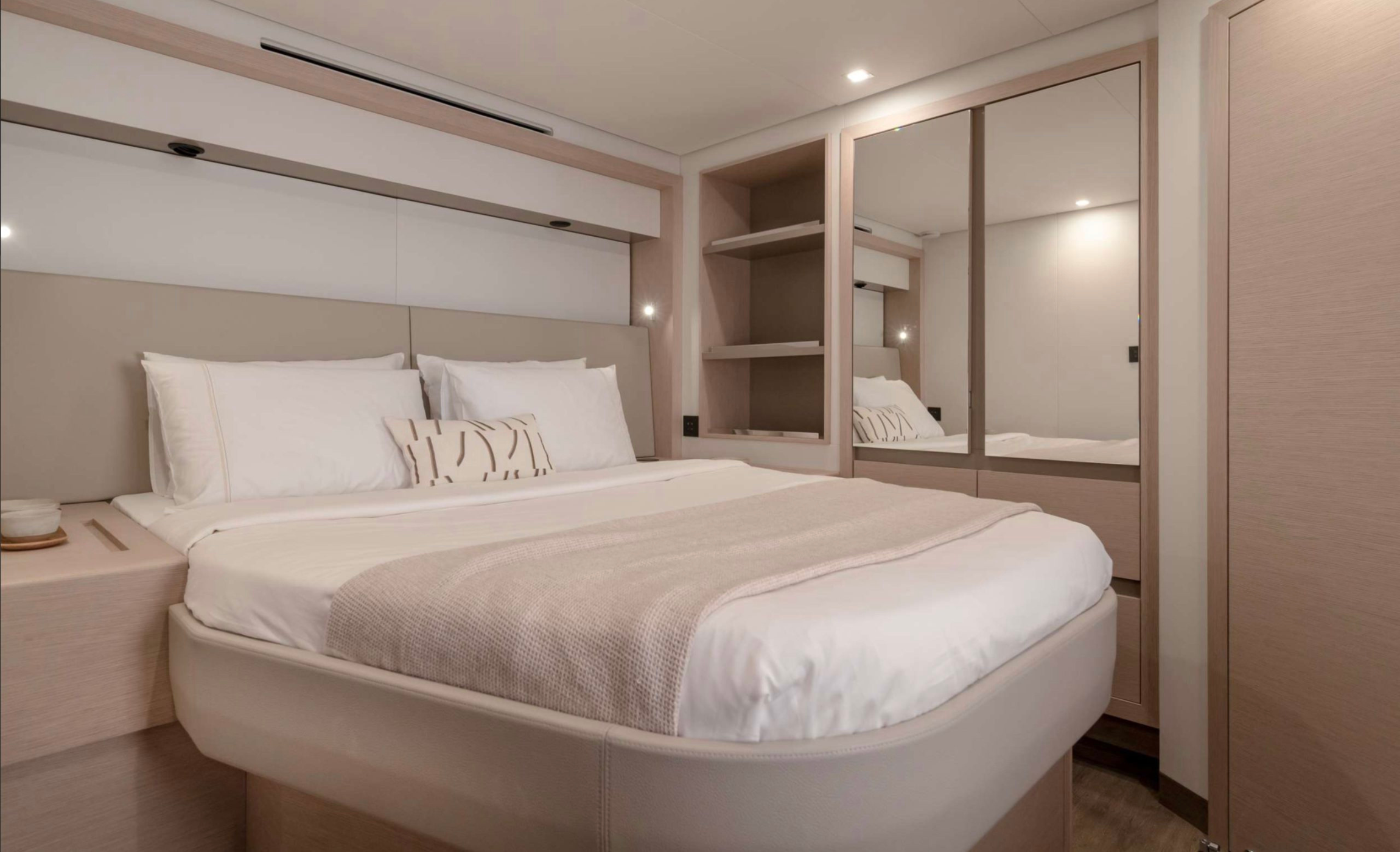 Windkind is a new Fountaine Pajot Thira 80 sailing catamaran launching in July 2026 and taking bookings from 9th December in the Caribbean. She is a vast catamaran with 5 cabins for 10 guests, comprising one master and one VIP each with a King/Queen sized bed and three additional double cabins. Each cabin is equipped with en-suite, air conditioning and ample storage. This layout optimises the space below deck to provide each crew member with their own en-suite cabin. These thoughtful touches are what sets Windkind apart, the owner has diligently analysed what will fit best for the boat for charter but also allow crew to have their own space. This 5 cabin version features the galley up so rather than the chef being hidden away, charter guests can witness the chef conjuring up all sorts of deliciousness. Typical to Fountaine Pajot they have a door that leads directly from the saloon to the foredeck and aft there are double doors which open to spill seamlessly onto the aft dining and lounging areas. Sofas frame the aft deck allowing for plenty of seating and lounging options away from the dining table. Port and Starboard are folding wings to create balconies opening up the dining area even wider. Up on the flybridge there are again multiple seating options and another dining table perfect for sunset cocktails or snacks under way. The foredeck is the ultimate sun worshippers haven with vast, luxurious loungers in place of the nets typically seen on catamaran foredecks, also features sunken sofas and a deck jacuzzi! The yacht is run with 4 professional crew who are there to take care of your every need. All photos are of a sister ship and a full photoshoot will take place following the launch.