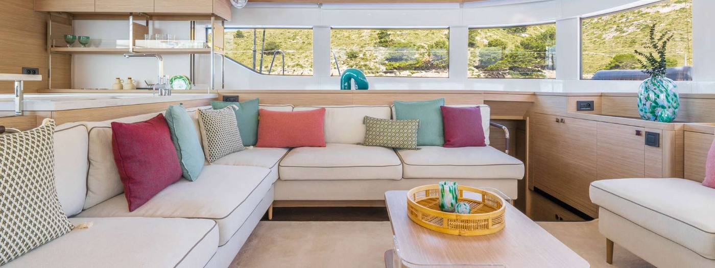 Inside, WISH offers a modern and airy interior, styled in a palette of soft neutrals and light woods. Wraparound windows flood the salon with natural light and provide a continuous connection to the surrounding seascape. A large L-shaped sofa and dining area are positioned opposite a well-equipped galley with clean, minimalist finishes.