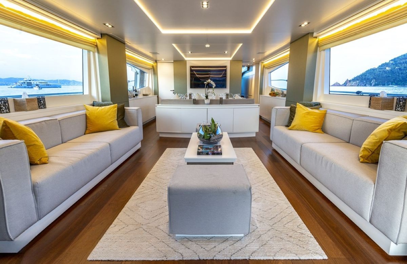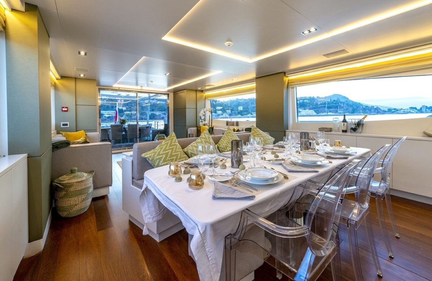 Her salon comprises the latest video - audio system & home cinema. It is spacious and in neutral tones which gives it a comfortable feel. It is also open plan on to the dining area which seats guests comfortably for the more formal dining whereas lots of space is found on her decks for alfresco dining options.