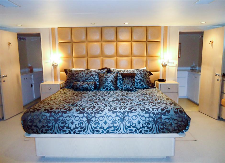 Motor yacht K offers accommodation for 8 guests in 2 double and 2 twin cabins. All guests cabins are easily accessed from the main salon on the starboard side via a wide staircase. The master cabin is amidships aft and full beam of the yacht with a walk around king size bed, full entertainment system with 32’’ flat screen TV and en-suite his and hers facilities featuring a bidet, shower and bath tub. A VIP cabin offers a queen size bed, entertainment system with 23’’ TV and en-suite facilities with shower and bath tub. The twin cabin has 2 single beds, entertainment system with 23’’ TV and en-suite facilities with shower. The final guest cabin offers a bunk bed configuration with small TV and en-suite facilities with shower. All 4 cabins are decorated in a neutral and simplistic yet relaxing style.