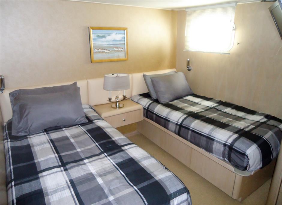 This newly painted yacht has a generous and contemporary interior that is comfortable and well kept. The salon and dining are an open plan featuring the salon aft and the formal dining space forward. An elegant neutral decor of light tones with a large U shaped sofa to port and occasional chairs to starboard create a welcoming setting. Forward the formal dining table seats 8 easily. Panoramic windows allow ample natural light and an open feel.