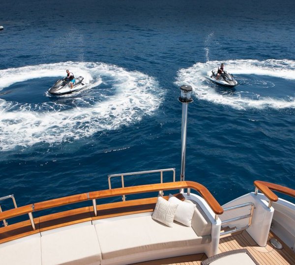 NOTABLE FEATURES: ~ Classic exterior profile ~ Elegant and modern interior ~ Vast outdoor areas ~ Large mosaic Jacuzzi ~ Outdoor cinema ~ Zero-speed stabilizers ~ Massage room and beauty salon ~ Gym ~ Highly professional crew of 14 ~ Great variety of water toys & tenders