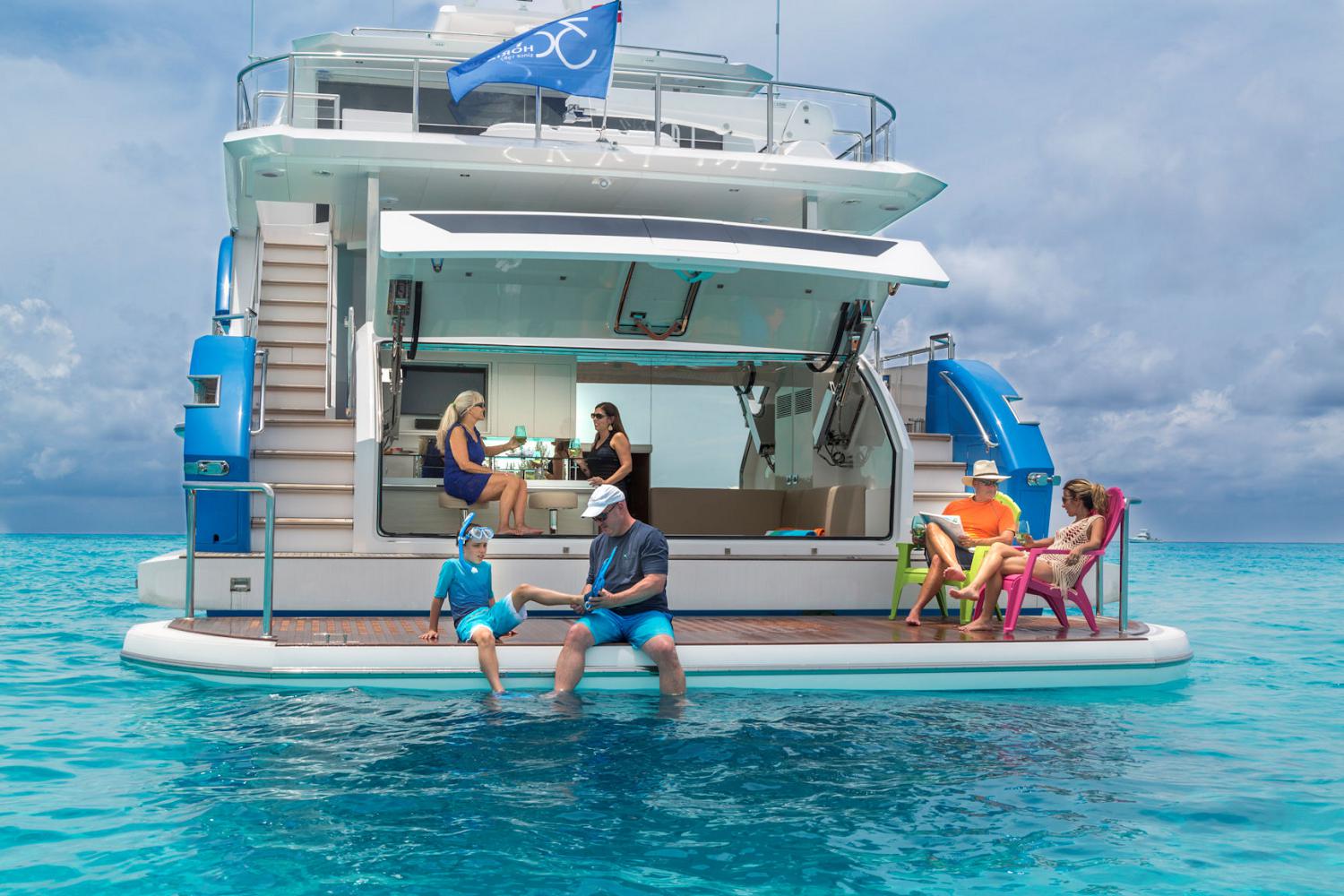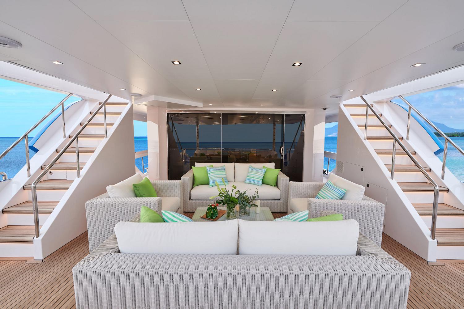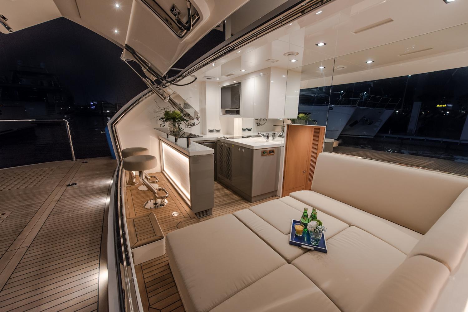 A spacious swim platform creates additional room for entertaining outside of the beach club, and two staircases connect up to the main deck aft seating, which consists of two loveseats and two armchairs around a low coffee table.