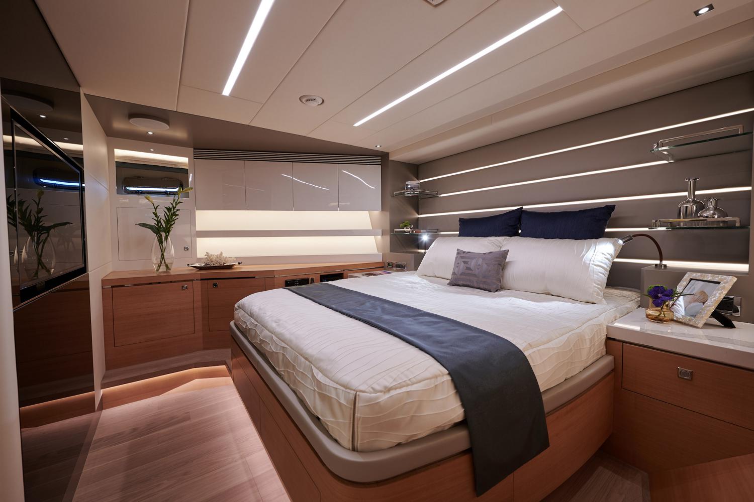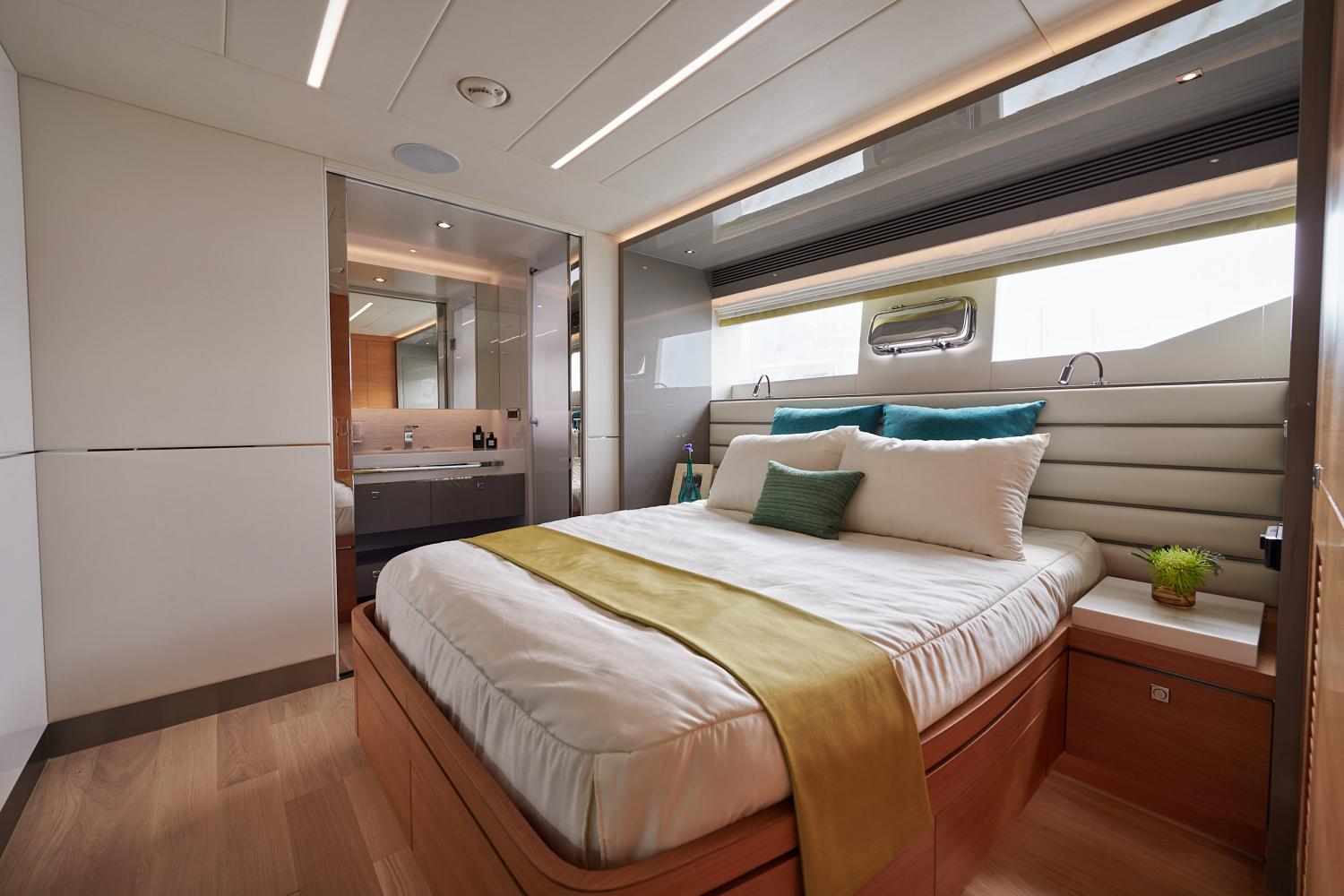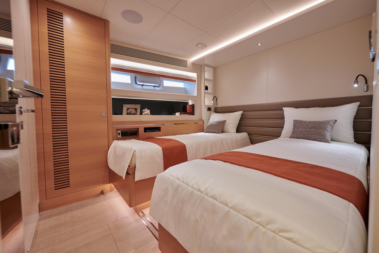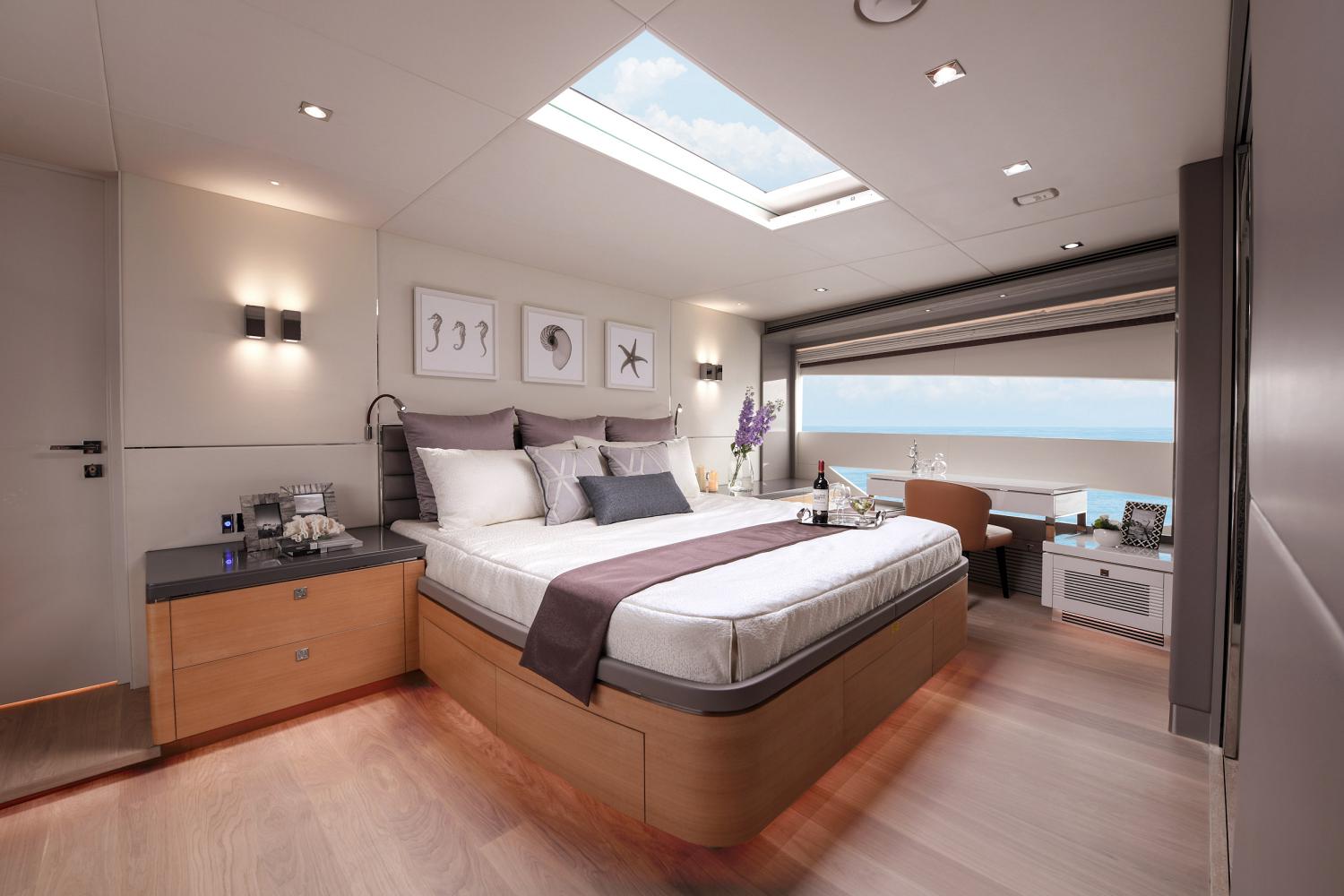The onboard accommodation sleeps a maximum of 12 guests over 5 en-suite cabins: 1 Master suite, 1 VIP stateroom, 2 double cabins and 1 twin cabin convertible to a double. ~ The Master suite is placed on the main deck forward and is furnished with a king-sized bed, a desk and sofa, a walk-in wardrobe and en-suite facilities consisting of his-and-hers sinks, a toilet and a shower. ~ The VIP stateroom on the lower deck in the bow has a spacious wardrobe and an en-suite bathroom. ~ The port and starboard double cabins placed amidships of the lower deck each have a wardrobe, sinks, toilet and shower. The twin cabin is placed to port between the VIP stateroom and a double cabin, and also has an en-suite bathroom with the same facilities. ~ The crew of 3 is accommodated in the stern behind the beach club.