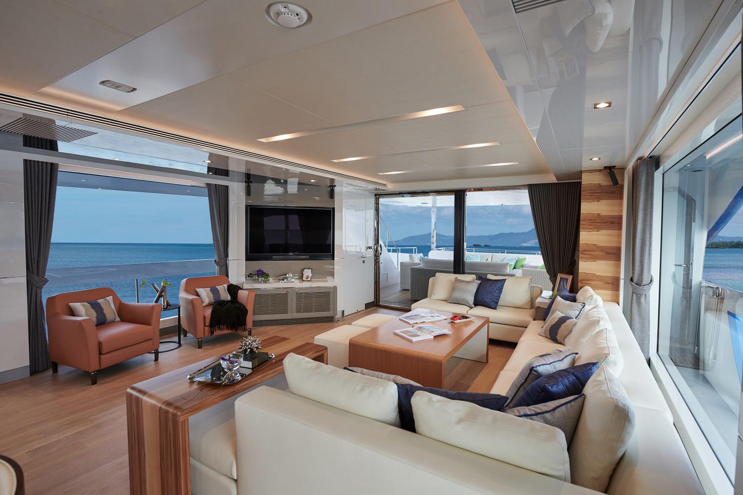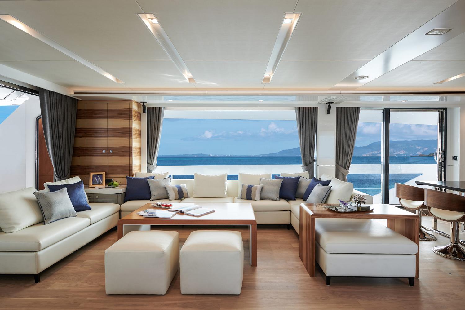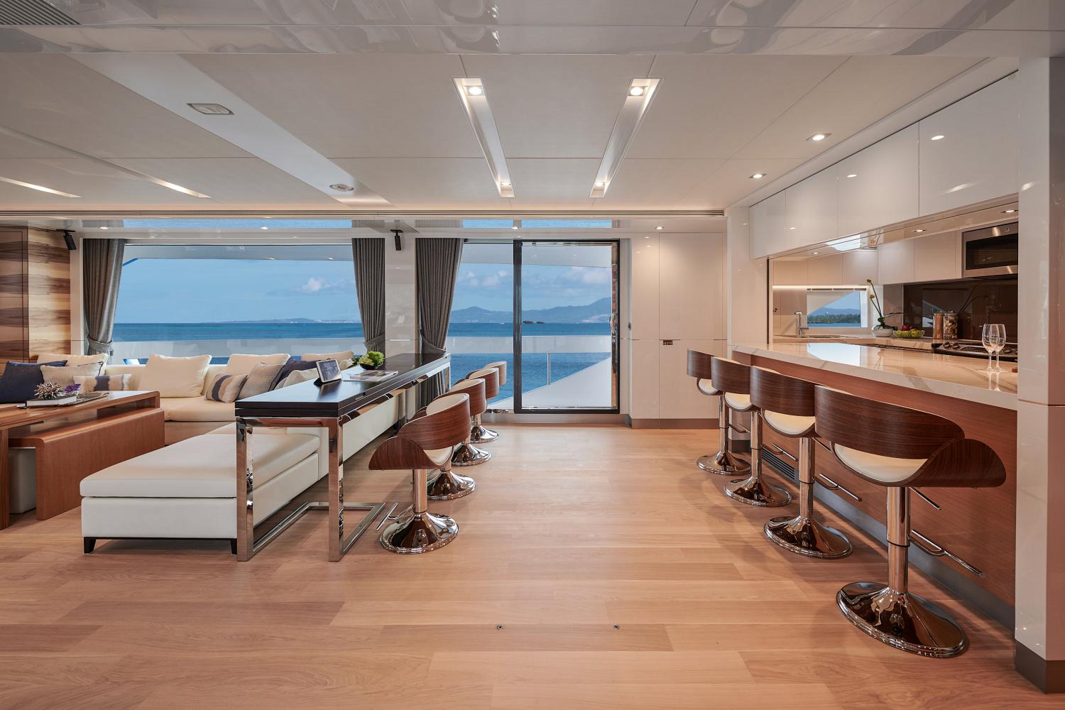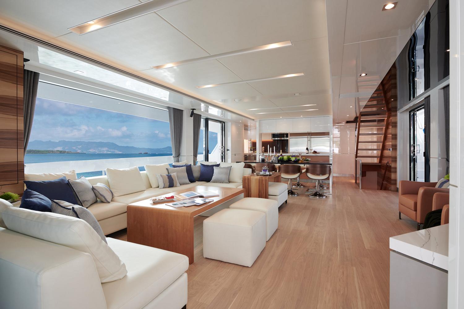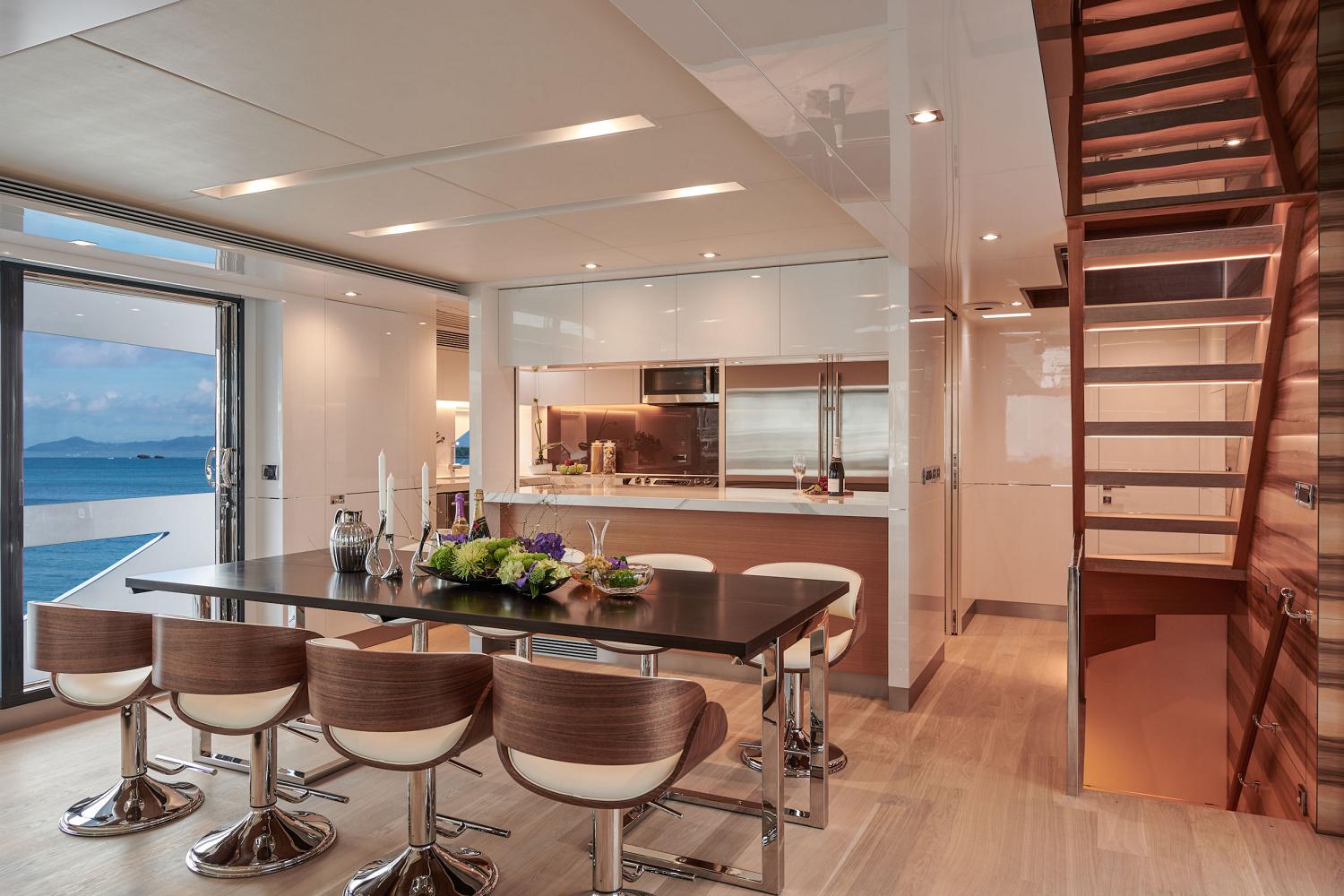 The main deck places the Master suite forward, behind which is the main foyer followed by the open-plan main salon that places the galley forward, the formal dining area in the centre with glass sliding doors to either side. The lounge contains an L-shaped corner sofa around a coffee table, and armchairs are placed beside the starboard windows. A day head is concealed in the aft starboard corner.