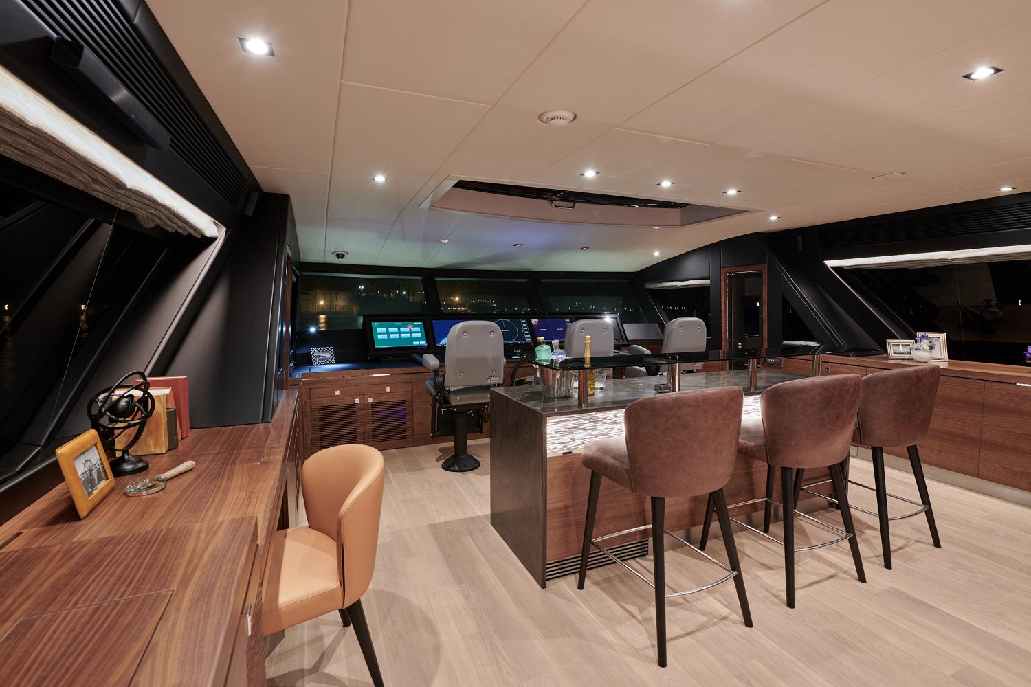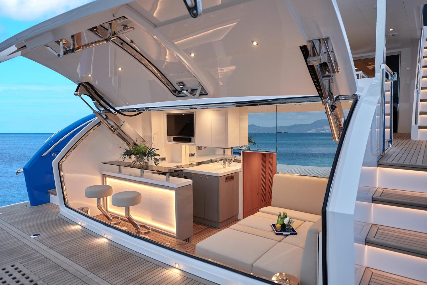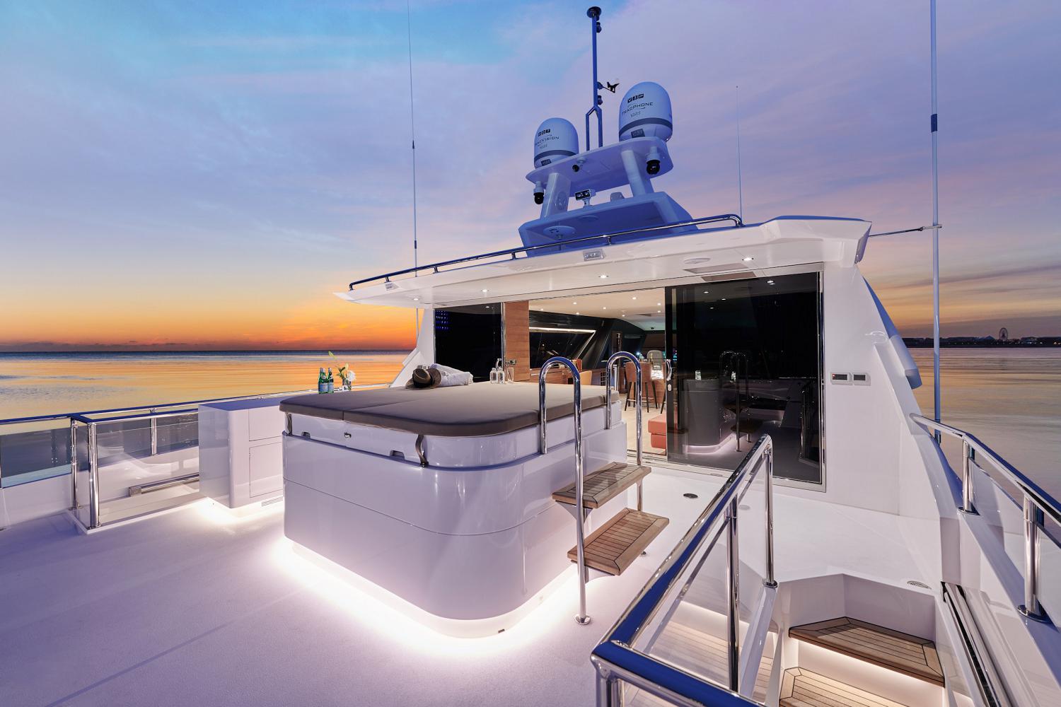 The upper deck has room along the stern for storing a tender, and a Davit crane provides a safe and efficient method for its launch and retrieval. A Jacuzzi is placed centre and beneath the shade of the hardtop, there is a port-side wet bar, and a starboard chaise-lounger and drinks table for outdoor relaxation at any time of the day.