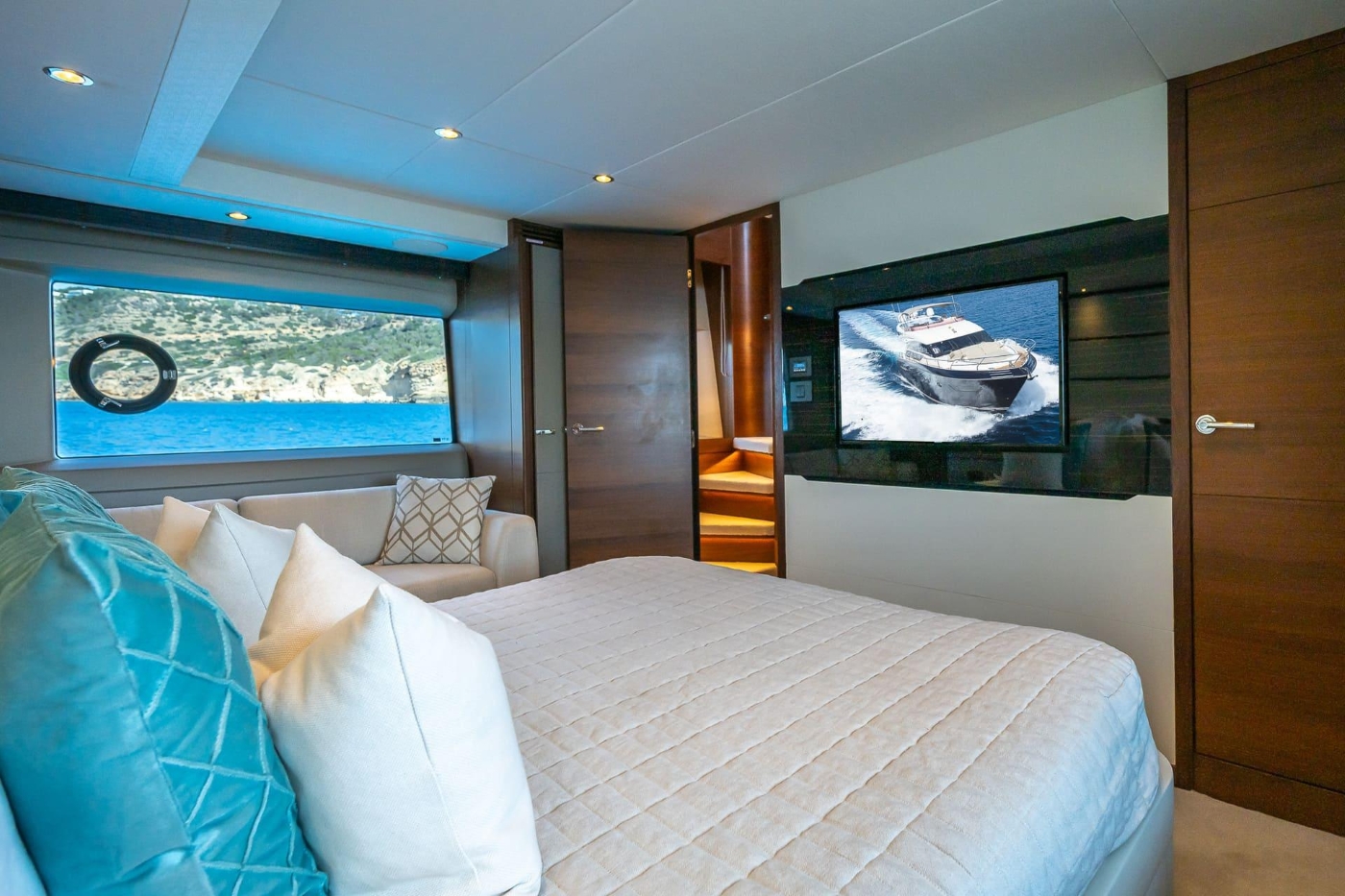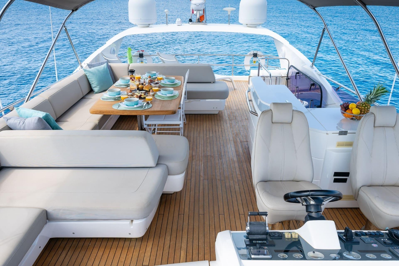 Inside, ZEN reveals a contemporary, open and luminous salon — designed for light and flow. Panoramic windows flood the space with natural sunlight while framing sweeping sea views. The main salon is furnished with a generous seating area, an LED television and a high end Harmon Kardon sound system, producing an inviting atmosphere for relaxation or social gatherings after a day on the water.