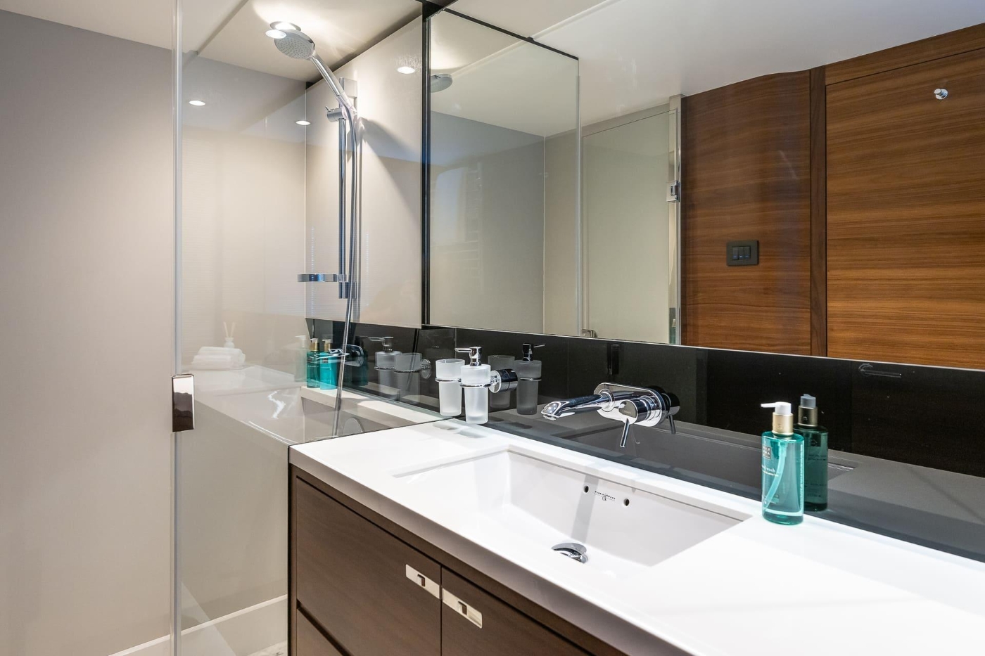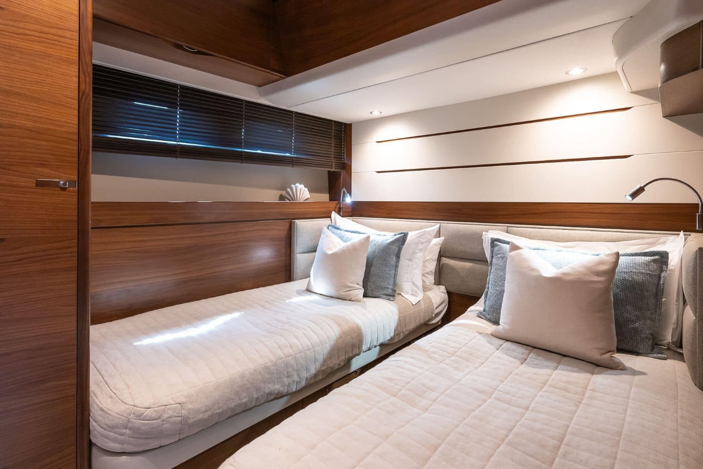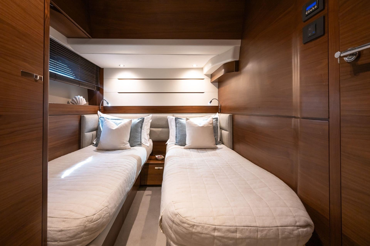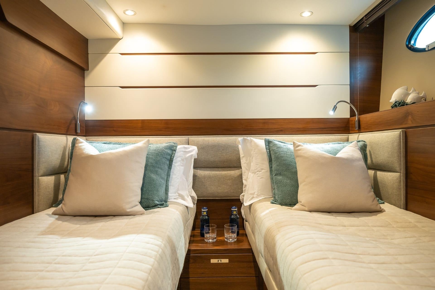 ZEN features four well-appointed cabins accommodating up to eight guests — a layout designed for comfort and flexibility: ~ Master stateroom — full beam amidships, with private ensuite, ample storage and a cosy two seater sofa. ~ Forward VIP cabin — double bed with private ensuite. ~ Two twin cabins — one of which converts into a double, sharing a modern bathroom — perfect for friends or flexible guest groupings. This configuration makes ZEN ideal for couples, friends or small families seeking understated elegance and practical comfort.