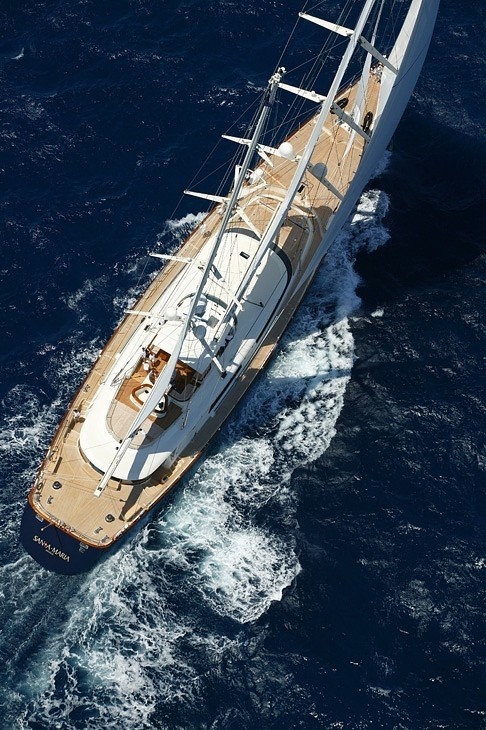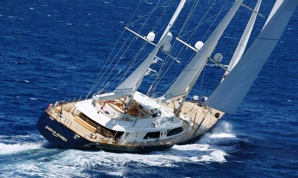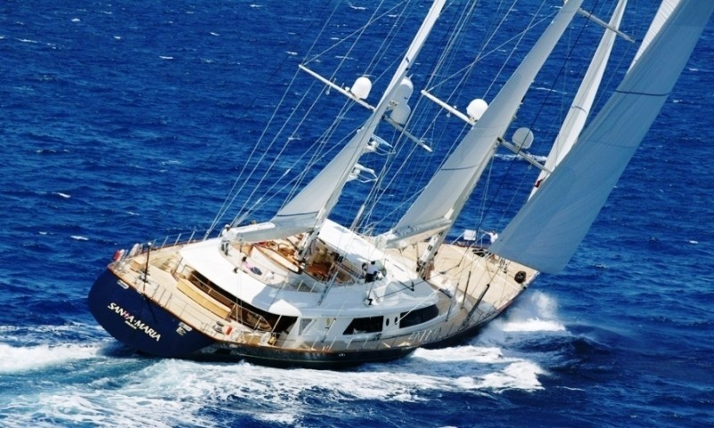 Sailing Yacht ZENJI (formerly called Santa Maria) was owned by Oracle's Larry Ellison has a 11,52m (37.80ft) beam, cruises at 13 knots with a maximum speed more than 15 and has a sail area of 1492 square metres. ZENJI features fully battened main and mizzens as well as in-boom furling and reefing. Her hull is sleek, navy blue and aluminium. Her sister ships are BURRASCA, ROSEHEARTY and SELENE.