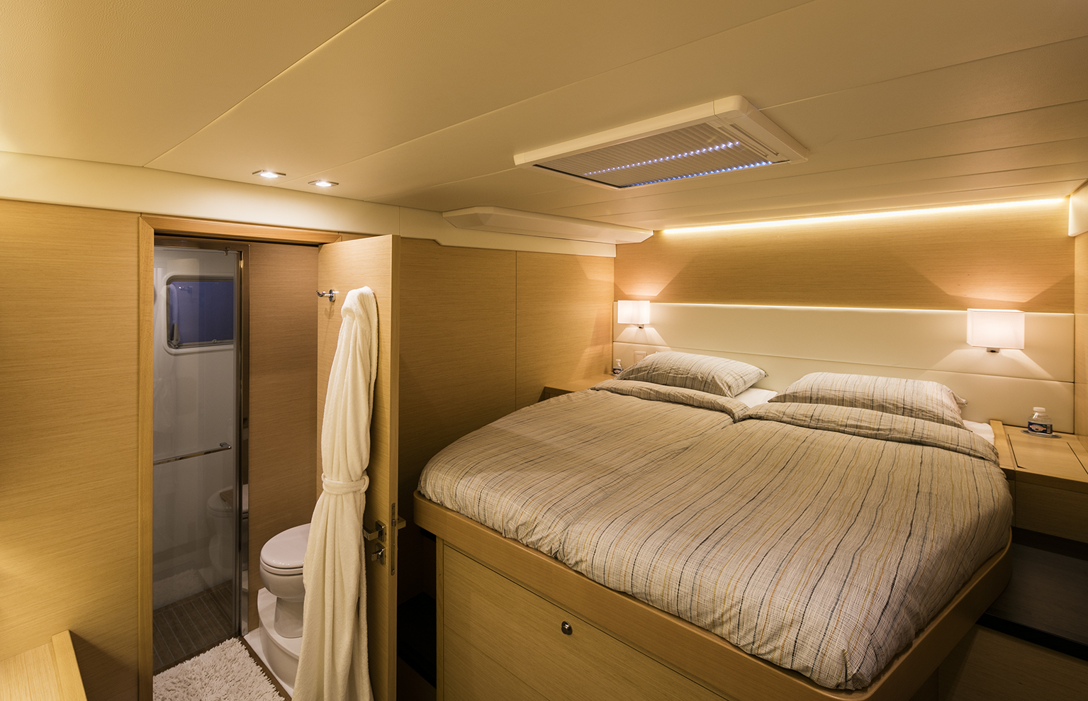 The master stateroom is to starboard and runs from aft of the yacht to just forward of amidships, complete with a private seating area, interior and exterior access, king size bed and large en-suite facilities.