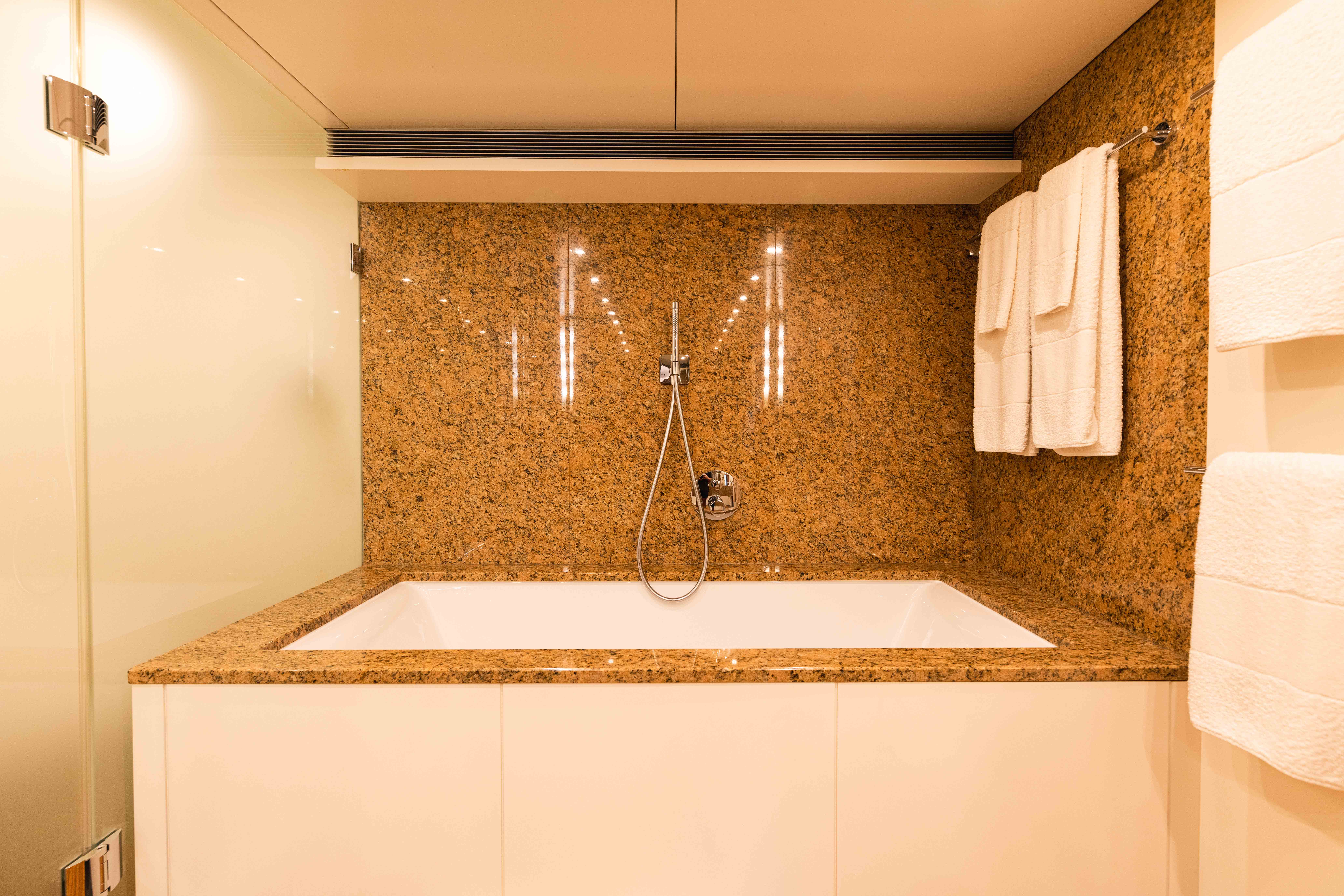 Another seating area, with seating around a romantic fire pit, is found on the bridge deck together with sun loungers. Guests will enjoy the popular sun deck with illuminated blue agate bar with seating, a saloon with panoramic views as well as a Jacuzzi hot tub for up to 8 charter guests.