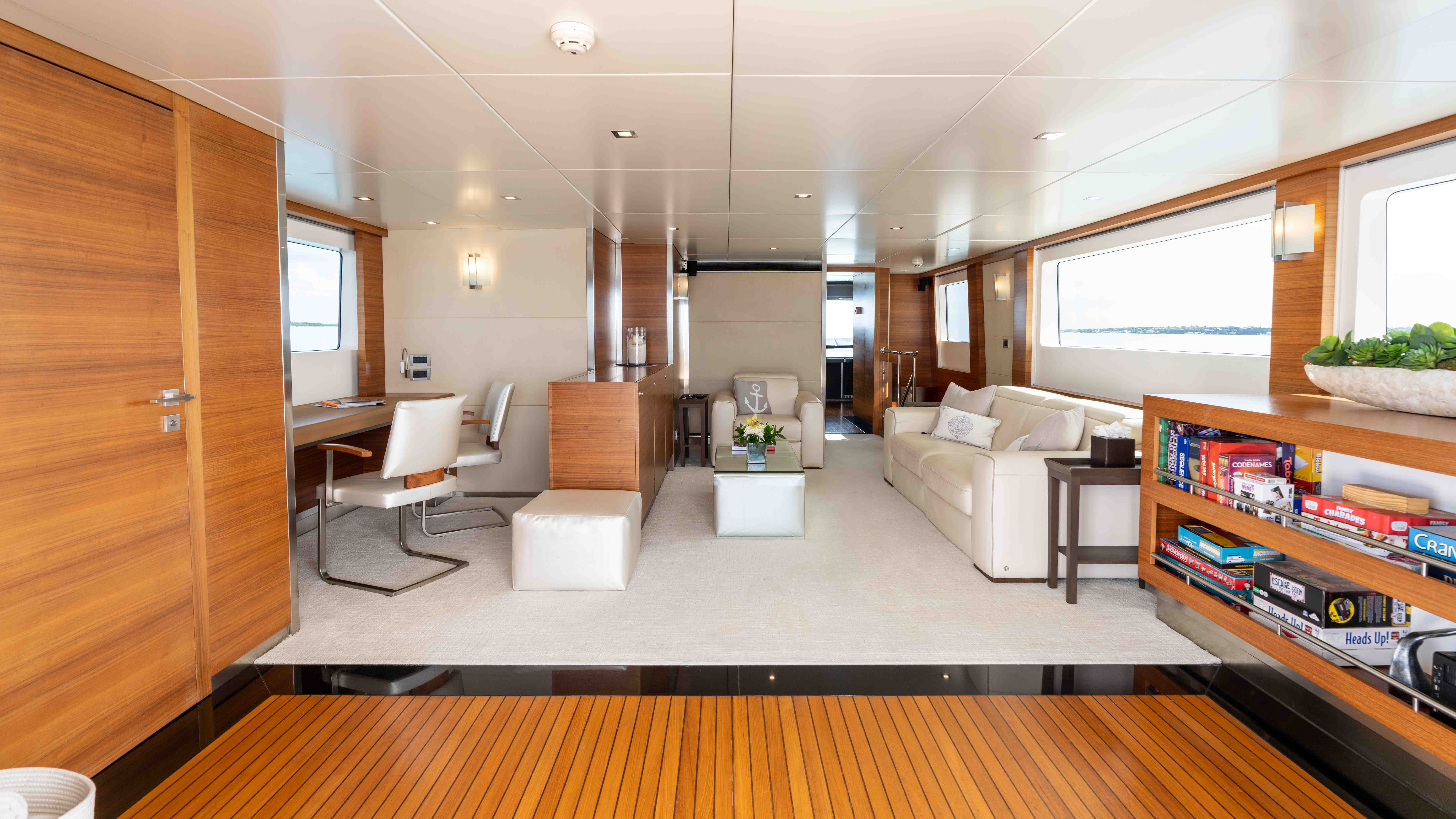 Aft of the main saloon the exterior aft deck area offers a great space to relax and unwind with a large sofa and coffee table, as well as a shaded alfresco dining area. Another seating area, with seating around a romantic fire pit, is found on the bridge deck together with sun loungers.