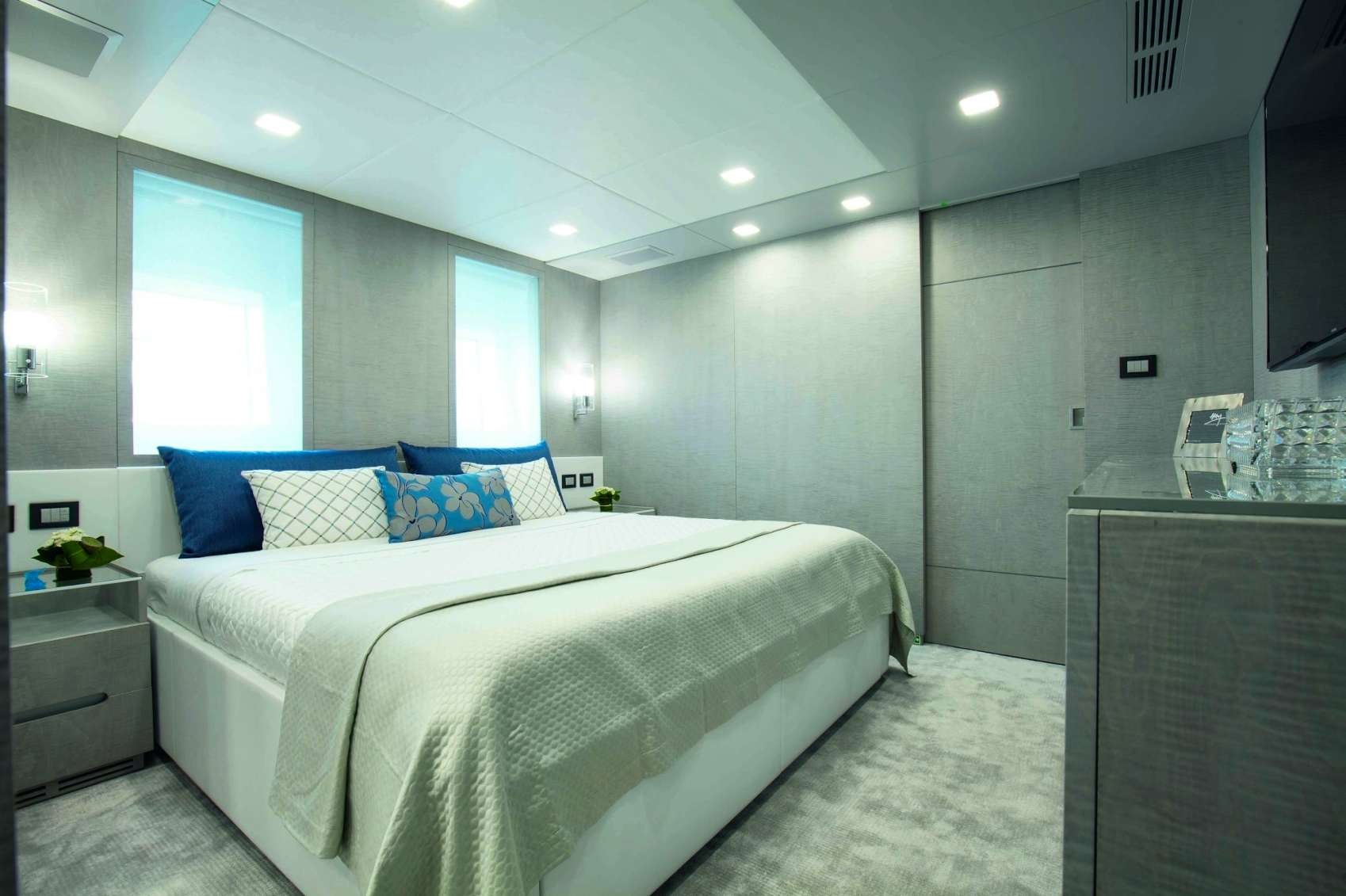 The master stateroom is complete with a meditation room with an oversized lounge bed and lavish his-and-hers en-suite bath. Located below deck, the superyacht’s guest staterooms are positioned at water level to provide tranquil views.