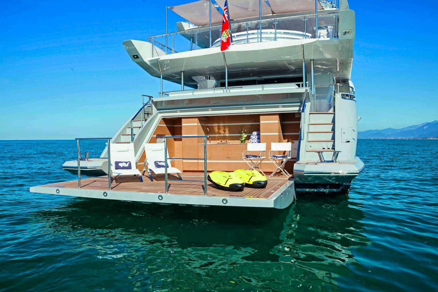 Boasting an exquisite multipurpose beach club, charter guests also can enjoy fun on water with the yacht’s plethora of water toys including a waterslide or just unwind in lounge chairs at the water’s edge.