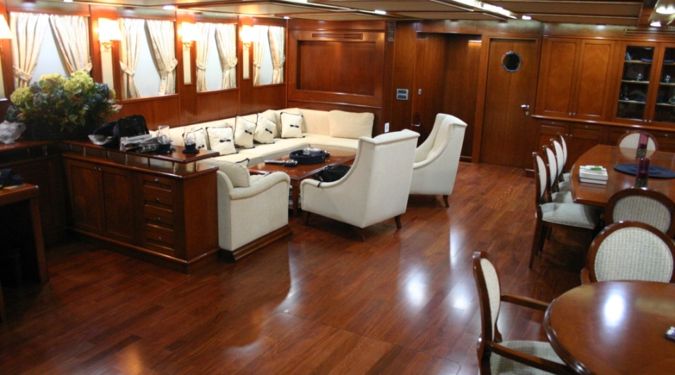 The main salon is in a raised position, featuring surrounding windows, a large sofa, occasional chairs, coffee table, wet bar and games table. Below decks aft is the full beam master cabin, while forward are a further 4 guest cabins. Seven professional crews have separate quarters, ensuring optimum privacy.