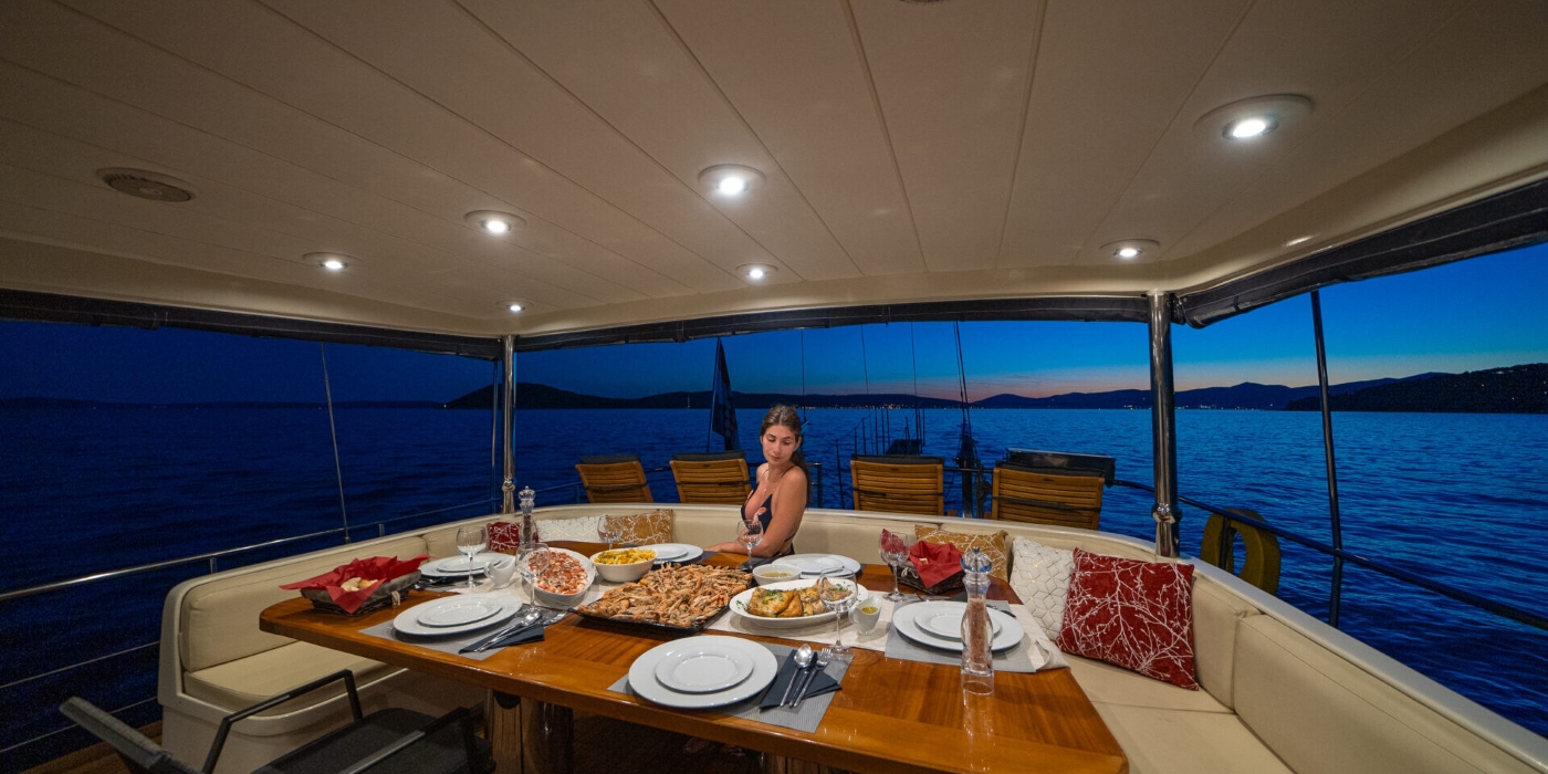 The aft deck has a covered alfresco dining option, ideal for formal or casual occasions. Further aft, the extended overhanging deck boasts chaise lounges and endless views. Thanks to a 360° wrap around main deck, the foredeck is easily accessed and features additional chaise lounges and ample teak deck space.