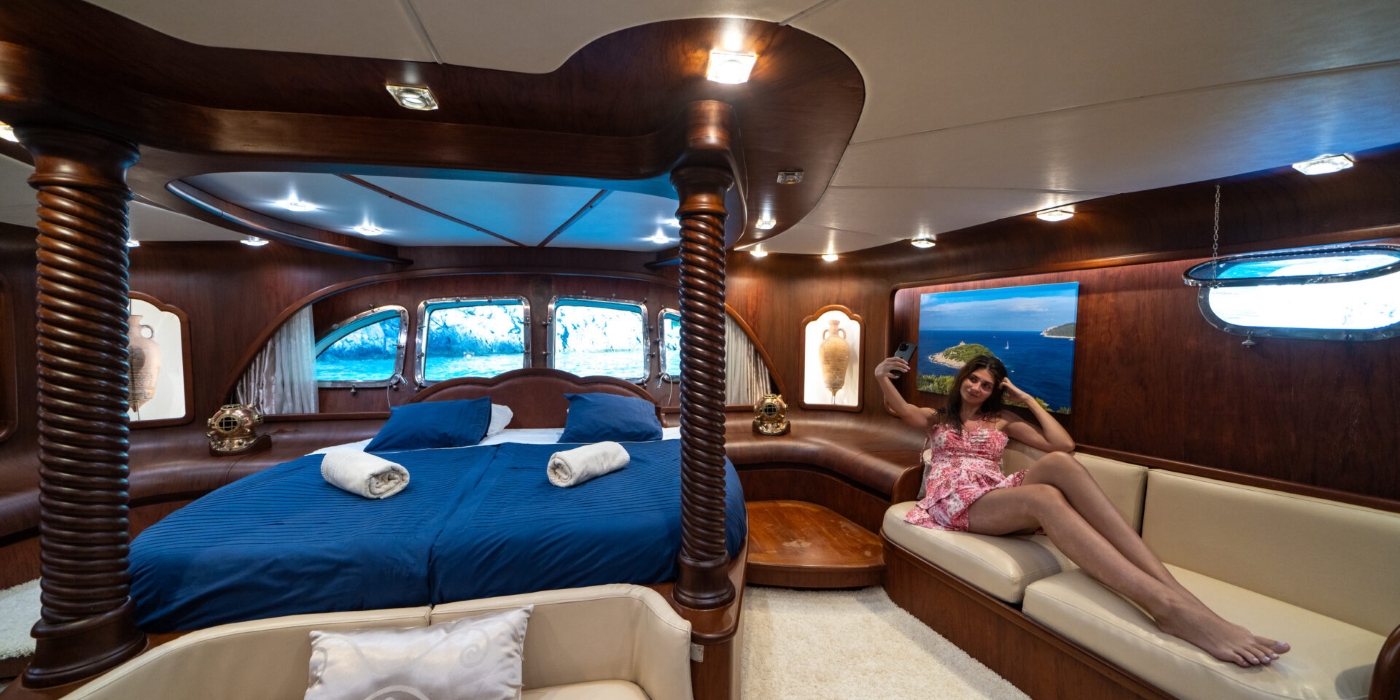 On deck, guests will find the gulet charter yacht ALBA offers plenty of areas to enjoy. The aft deck has a covered alfresco dining option, ideal for formal or casual occasions. Further aft, the extended overhanging deck boasts chaise lounges and endless views.
