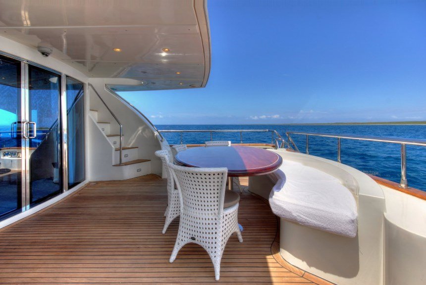 DREAM YACHT has plenty of exterior living on three decks. Adjacent to the salon is the partially shaded aft deck, with alfresco dining table and seating.