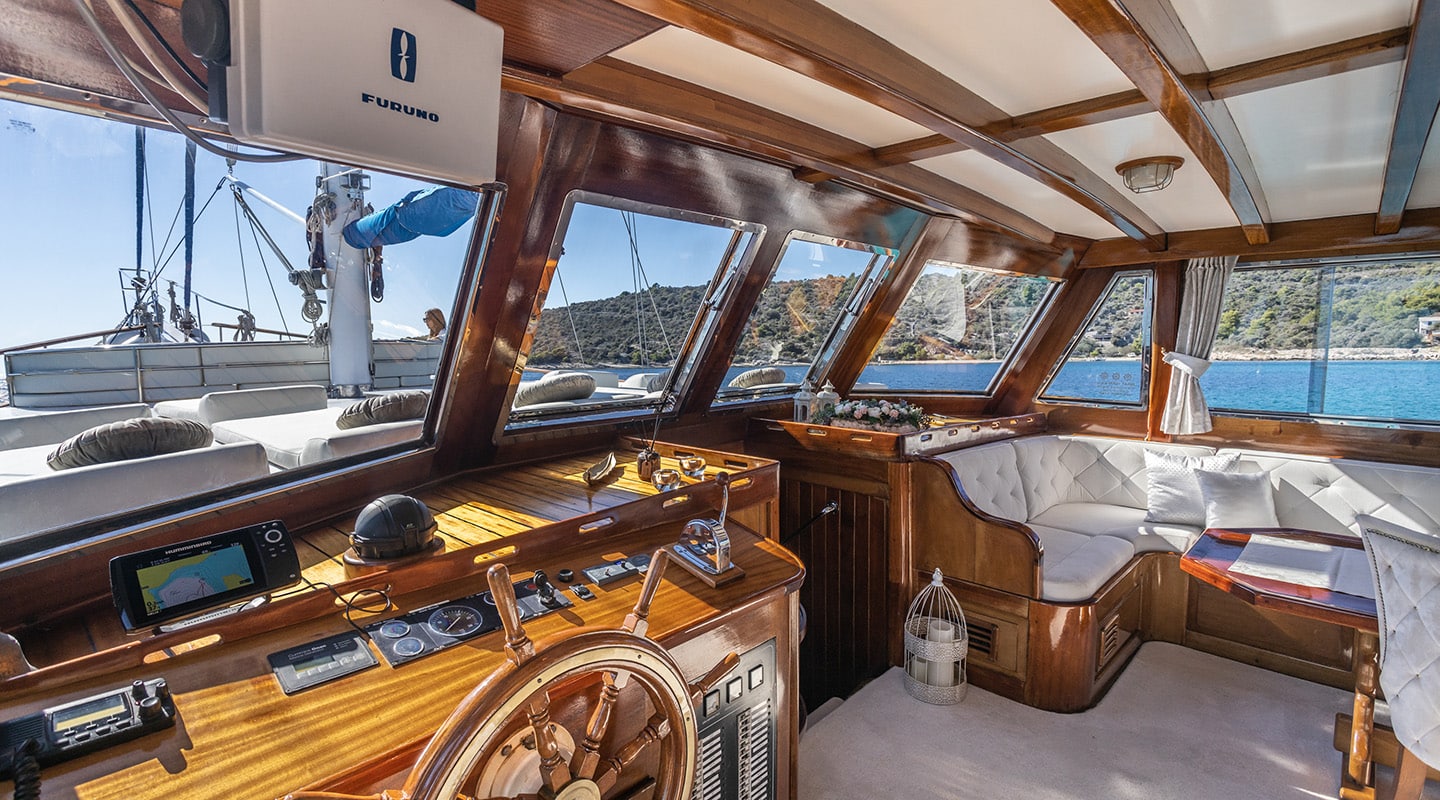 There is a dining setting with in-built bench seating plus a bar and helm controls.