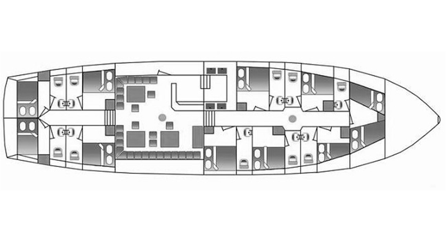 The salon is an open plan, featuring a lounge, 2 tables and a wet bar. Surrounding panoramic windows allow ample natural light to compliment the space. Below decks are 8 charter guest cabins, each with private en-suite facilities. Below decks, sailing yacht NAUTILUS offers spacious accommodation for up to 14 guests, in 8 double cabins.