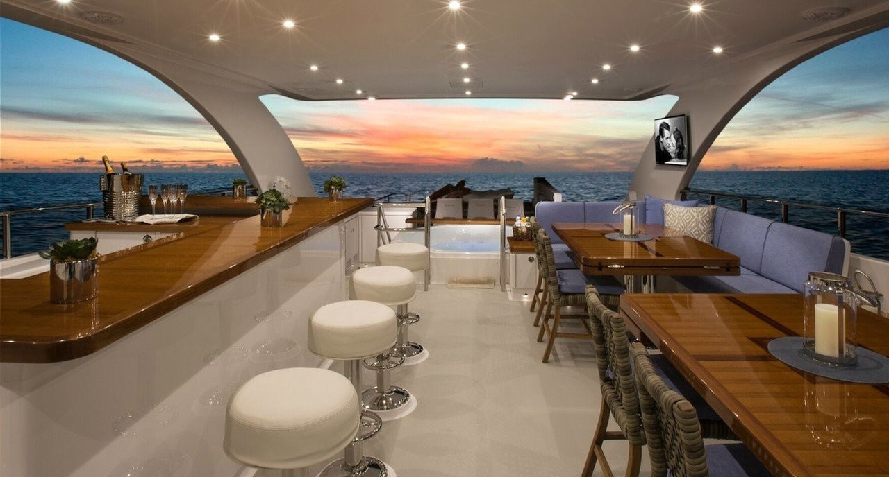 Forward of the salon is a formal dining area, offering a partial wall with intricate glass etching, creating a slight separation from the salon and infusing an elegant ambiance. Thanks to the salons large side windows, the yacht boasts great views and plenty of natural light.