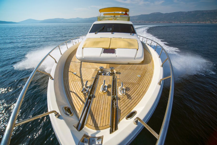 From port and starboard, side decks lead safely to the capacious foredeck and large sunpad. On the upper deck, guests can dine alfresco, soak up the sun on the sunpad, and relax under the optional Bimini cover, all while enjoying the endless vistas.