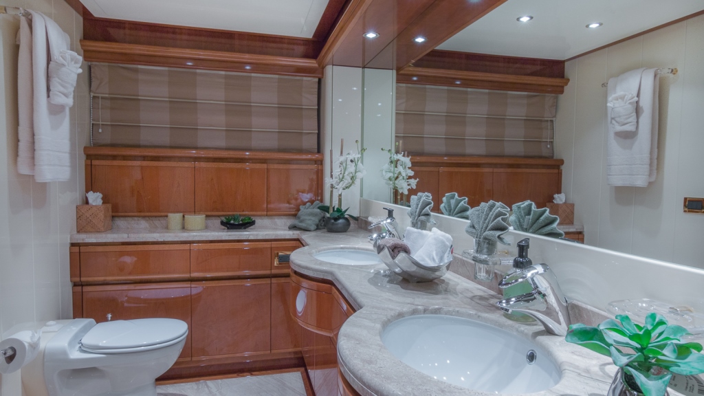 PARADISE’s salon boasts timeless high gloss cherry wood panels, lavish leather soft furnishings, plush carpets and neutral headlining, all surrounded by panoramic windows by day and soft lighting by night. Below decks, 4 stylish guest cabins each have en-suite facilities.