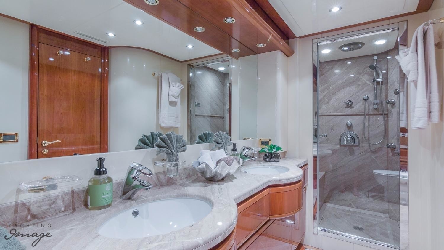 Luxury Ferretti motor yacht PARADISE offers accommodation in 4 en-suite cabins, for up to 8 charter guests. The master suite is amidships with a center lined king size bed, seating and vanity.