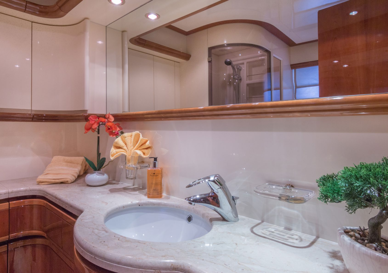 Further aft, steps down give way to an extended swim platform and teak beach, ideal for the active water enthusiasts, or to simply enjoy the tranquil surroundings, with an evening cocktail. 360° wrap around decks leads forward to a capacious foredeck and perfect sunning area, complete with sunpads and seating.